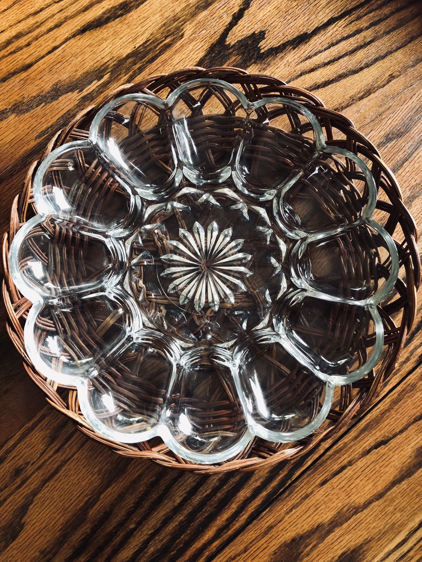 Crystal deviled egg serving tray, in decorative wicker basket.