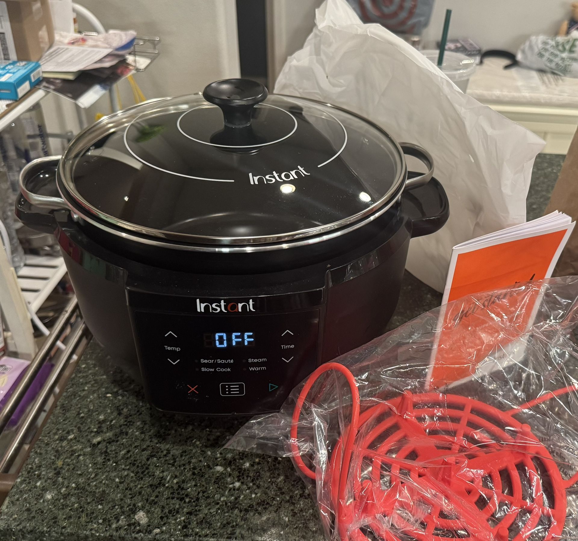 Only used one time it was a little too big for me, but it works great have original box. Brand Instant Pot Color Black Material Plastic Product Dimensions 15.16"D x 14.02"W x 10.24"H Capacity 7.5 Quarts Wattage 800 watts 4-IN-1 FUNCTIONS: slow cook, sear/sauté, steam and warm REPLACES 9 COOKING APPLIANCES AND TOOLS: slow cooker, steamer, sauté pan, saucier, warmer, roaster, braiser, non-stick pot and food storage 7.5QT LARGE CAPACITY: deep skillet with more cooking area than a 12" skillet; can easily fit 5 pounds of chicken or 3 racks of ribs DELICIOUS ONE-POT COOKING: sears food using sauté function to seal in flavor before slow cooking; reduces sauce after slow cooking with sauté function for thicker sauce FLEXIBLE: adjust the cooking settings to fit your recipe VERSATILE & LIGHTWEIGHT: aluminum inner pot is over 80% lighter than ceramic inner pot* for easier carrying from cooker to oven (up to 350°) to table HANDY: glass lid with stay-cool knob and handles on cooker base make holding and carrying easy FAMILY SIZE: holds up to 7 servings EASY TO CLEAN: dishwasher-safe glass lid and silicone accessories, plus non-stick ceramic-coated aluminum cooking pot