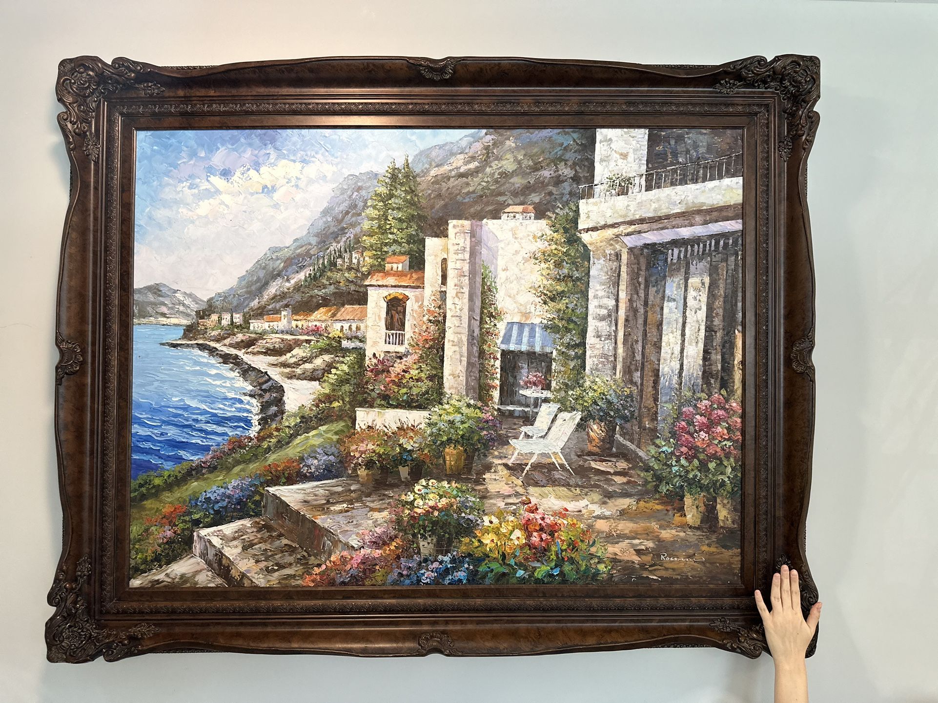 Transform your space with this stunning and grand original oil painting, capturing a serene coastal Mediterranean landscape. This gorgeous artwork features vibrant and masterfully blended colors, depicting charming architecture, flourishing gardens, and the sparkling blue waters of the sea. It is normally for art museums!! You can check the photos as a reference how giant this painting is, I put my hand as a reference, and the last photo with myself as a reference. The painting is complemented by a truly unique, intricately hand-carved, and detailed embroidered wooden frame, enhancing its elegance and sophistication. At 58 inches by 45 inches, this large statement piece is perfect for elevating your living room, office, or any space that deserves a touch of timeless beauty and character. This masterpiece combines exceptional craftsmanship with a breathtaking subject, making it an extraordinary addition to any art collection. Don’t miss this rare opportunity to own a one-of-a-kind treasure!