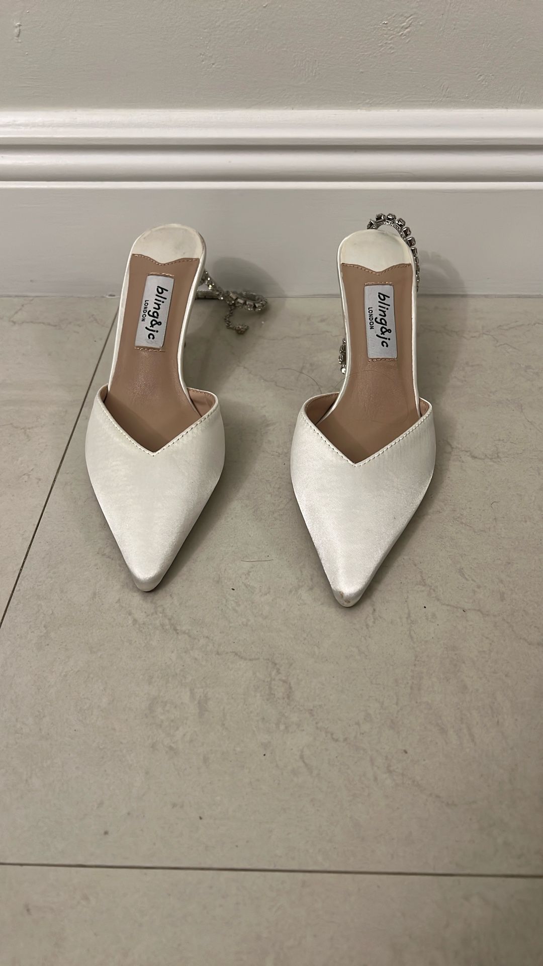 Beautiful white Satin shoes open back with rhinestones straps & 3” heal. Great for wedding, formal or semi formal wear, graduation, 15th! Brand new!