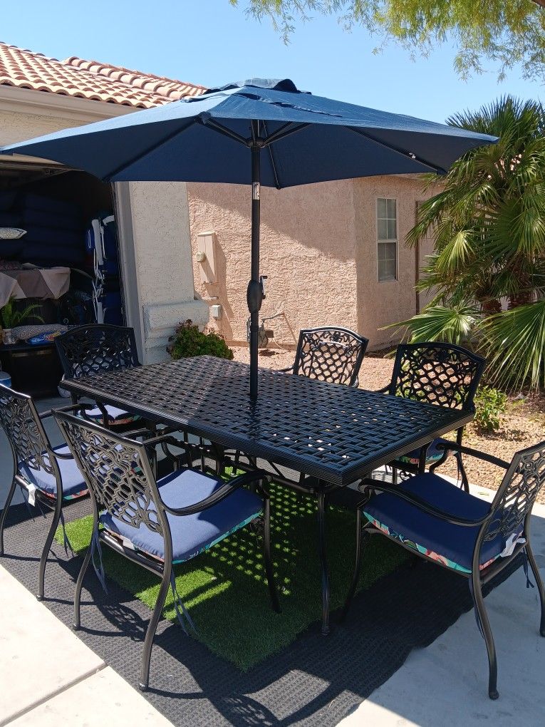 Patio Set Heavy Metal Table And 6 Chairs With New Cushions And New Umbrela