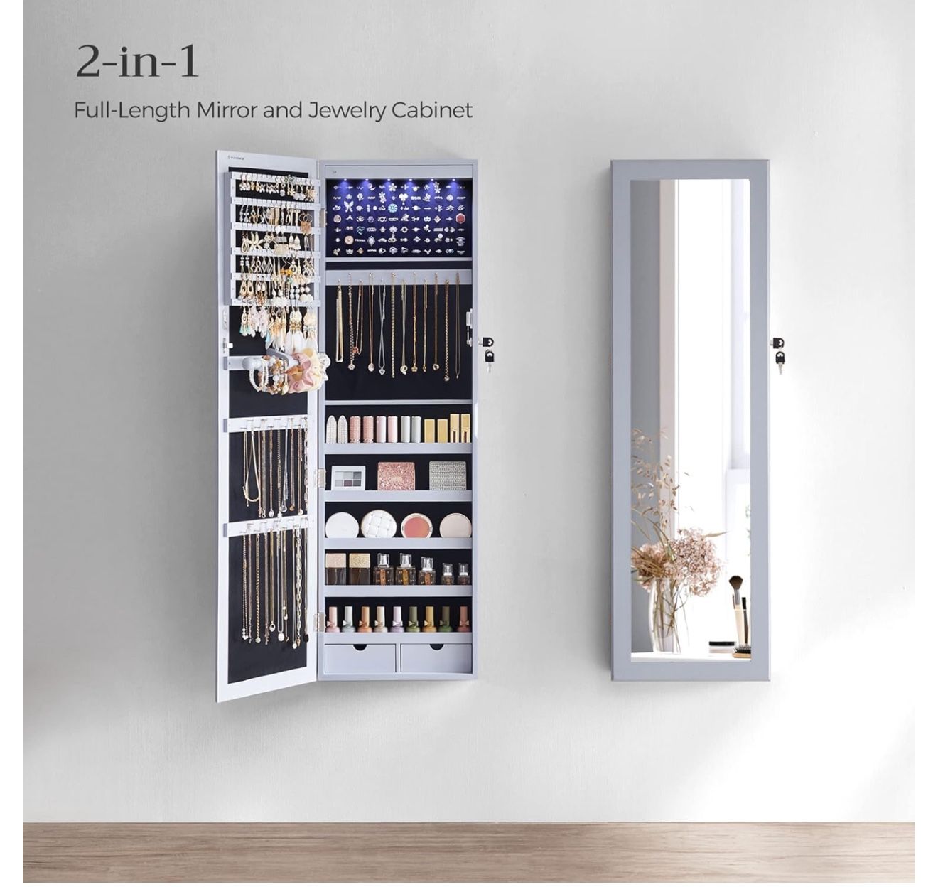 New in box 6 LEDs Mirror Jewelry Cabinet, 47.2-Inch Tall Lockable Wall or Door Mounted Jewelry Armoire Organizer with Mirror, 2 Drawers, 3.9 x 14.6 x 47.2 Inches, Gray UJJC93GY