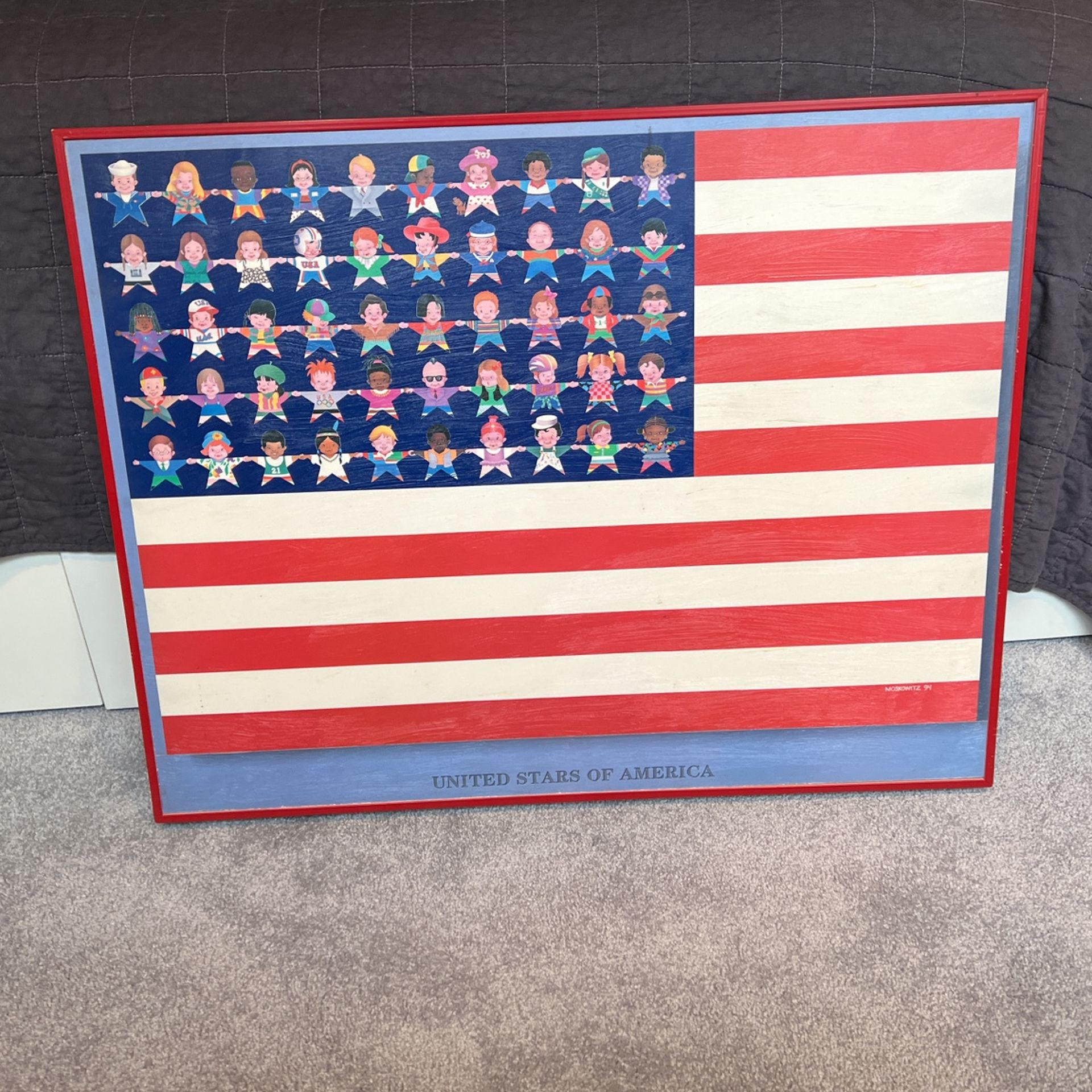 Reproduction of United Stars of America by Stuart Moskowitz. Adorable American flag painting with children as the stars. Canvas. Great for child’s room. 27 by 21 by 2.25” deep.