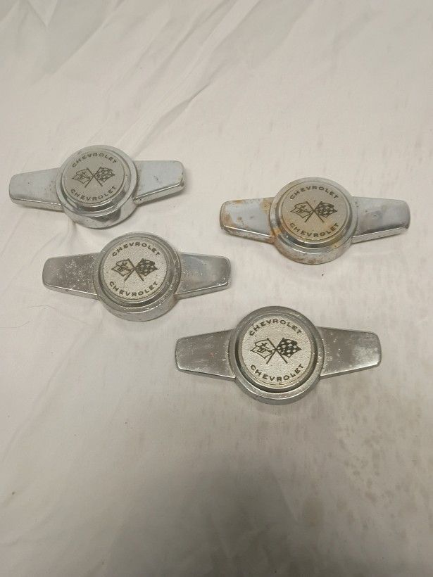 These are used 1(contact info removed) Chevrolet Corvette hubcap spinners. They are a Licensed GM Restoration Part. The original GM part number is (contact info removed). They were also used on some 1(contact info removed) Impala, Nova, Chevy II, and Corvair models. They are typically made of chrome-plated zinc or similar materials.