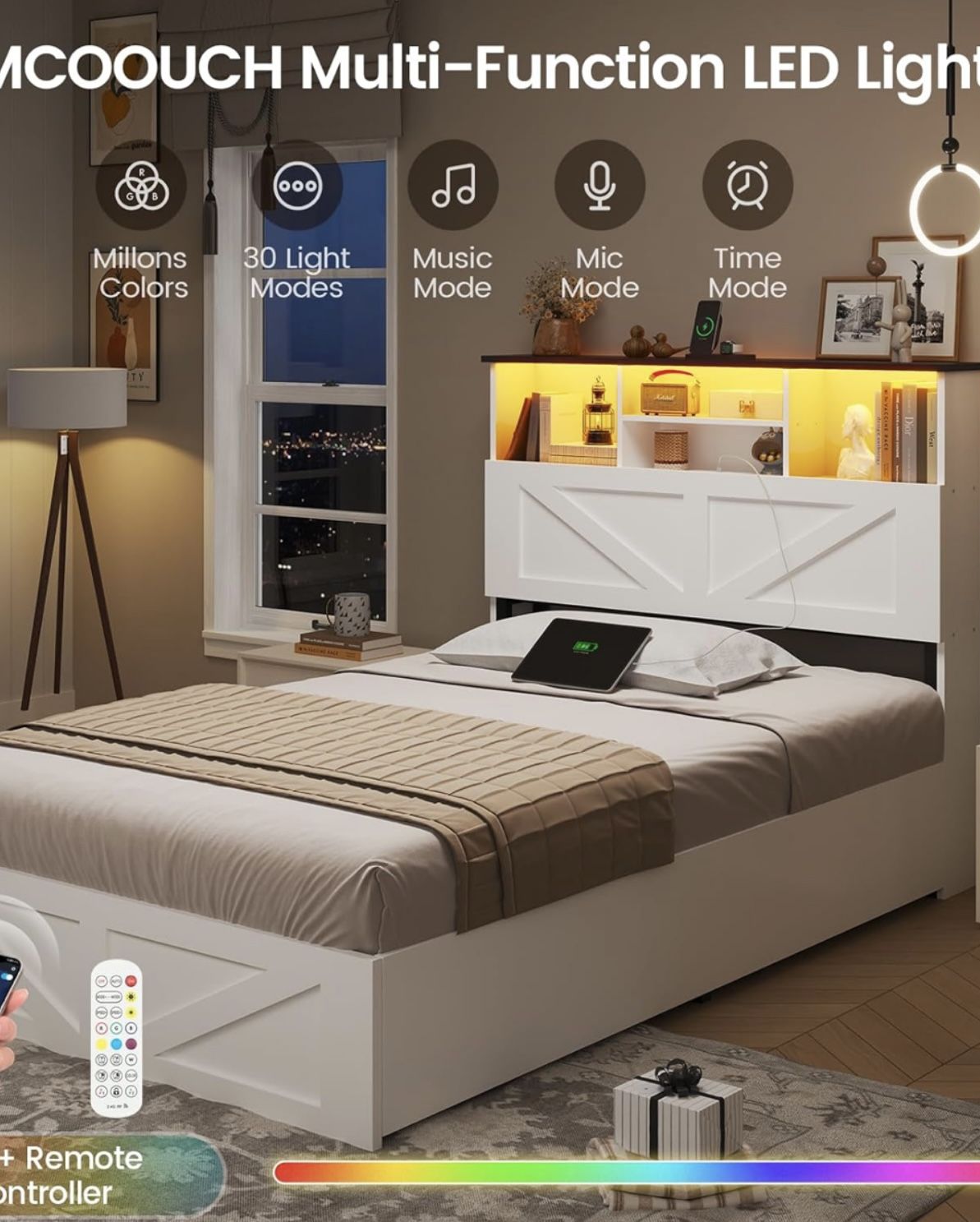 Still in the box, Farmhouse Twin Bed Frame with 4 Storage Drawers and Charging Station,Wooden Led Twin Bed with Storage Hidden Space Headboard and Metal Slats,No Spring Box Needed,White. Will also include a barely used twin size 10 inch mattress.