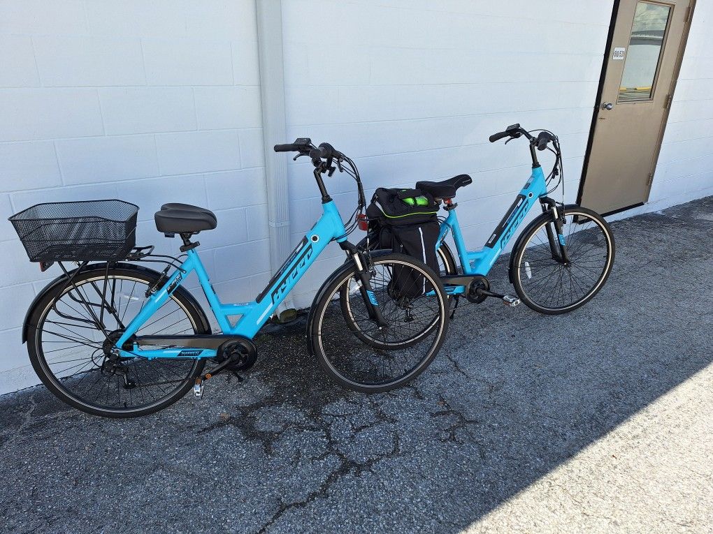 Pedal assist electric bikes, 28inch wheels, battery display, 6 speed, removable battery, 20mph for 20 miles. $475 each basket and bags not included