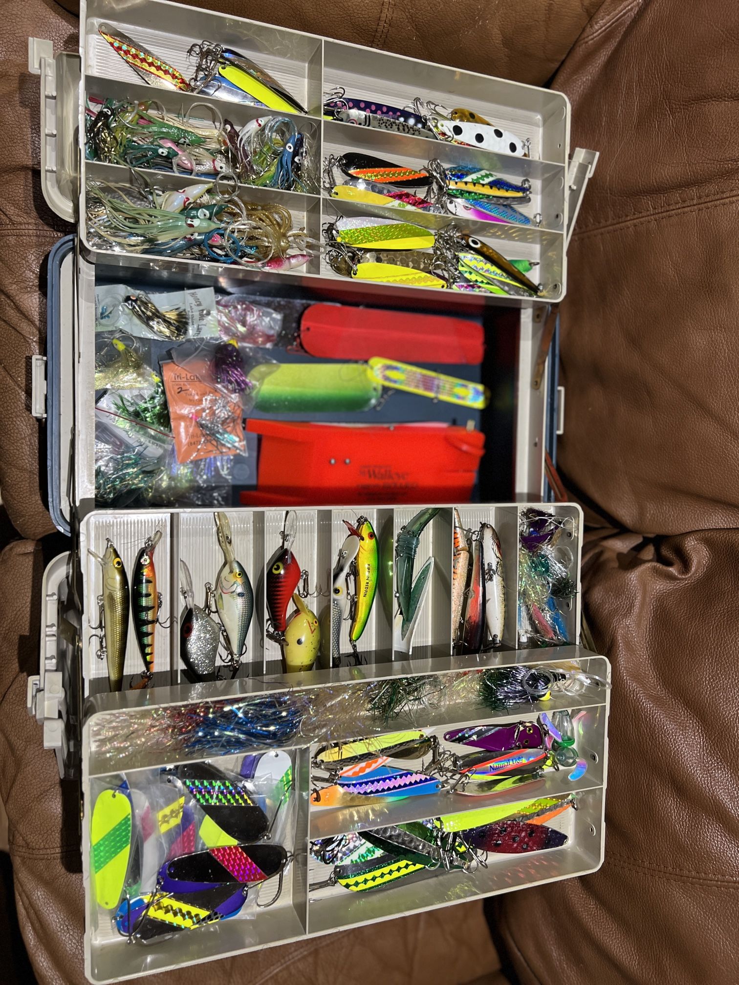 If you see this posting, it's available Tackle box filled with salmon/ trout spoons, jplugs, dodgers, crank-bites, lures, flies, spinners, for trolling, downrigger, planer boards, dipsy divers, salmon, trout fishing, over 150 items. One brand new planer board included. All you need to start catching the big ones! Price is for all you see in the box, no pickings, no asking for one specific item. If it's posted it's available. Cash only sale Pick up in Palos Hills IL 60465.