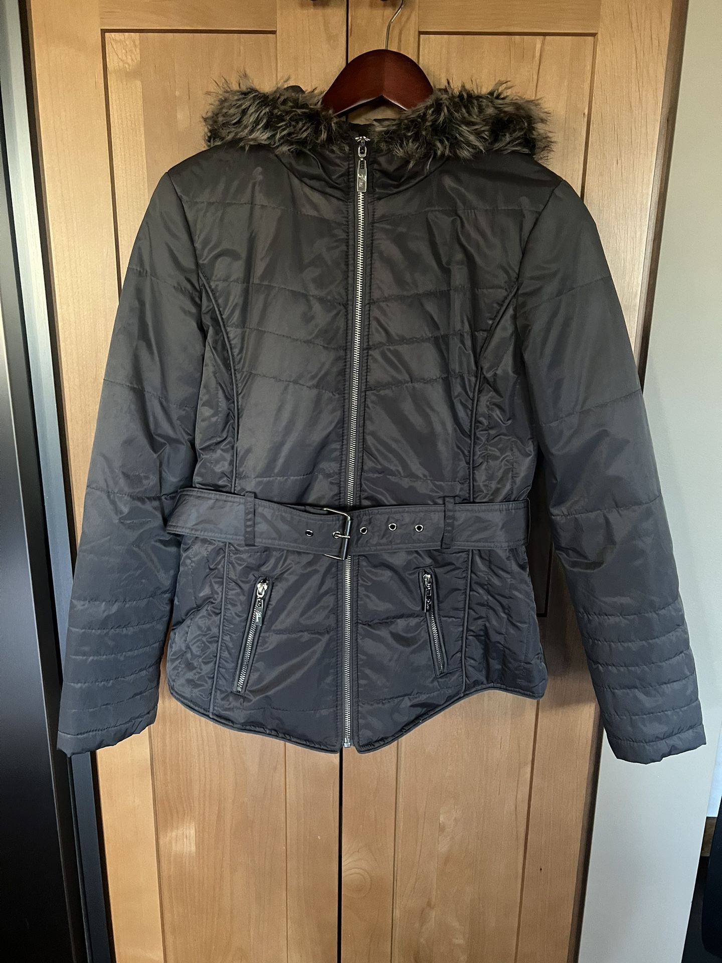 EUC women’s Guess jacket with belt and hood. Dark grey color (size m) No rips or tears
