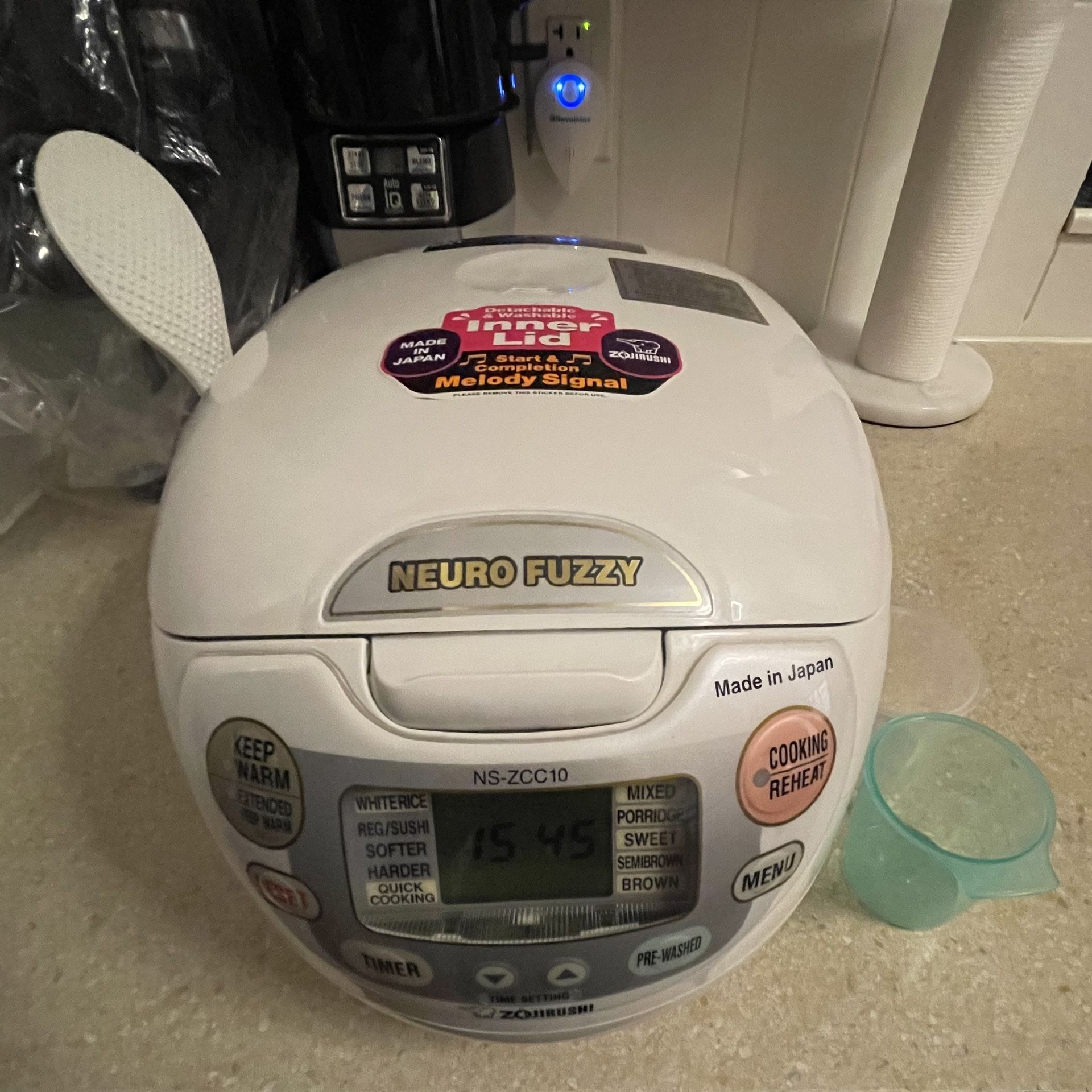 Up for sale is a Zojirushi neuro fuzzy rice cooker. 5.5 cups computerized rice cooker Premium white in color including two measuring cups. Stainless steel made in Japan. Capacity 1 liters. Wattage 680.00 used only once as you can see in picture looks brand new. No manual book or original box.