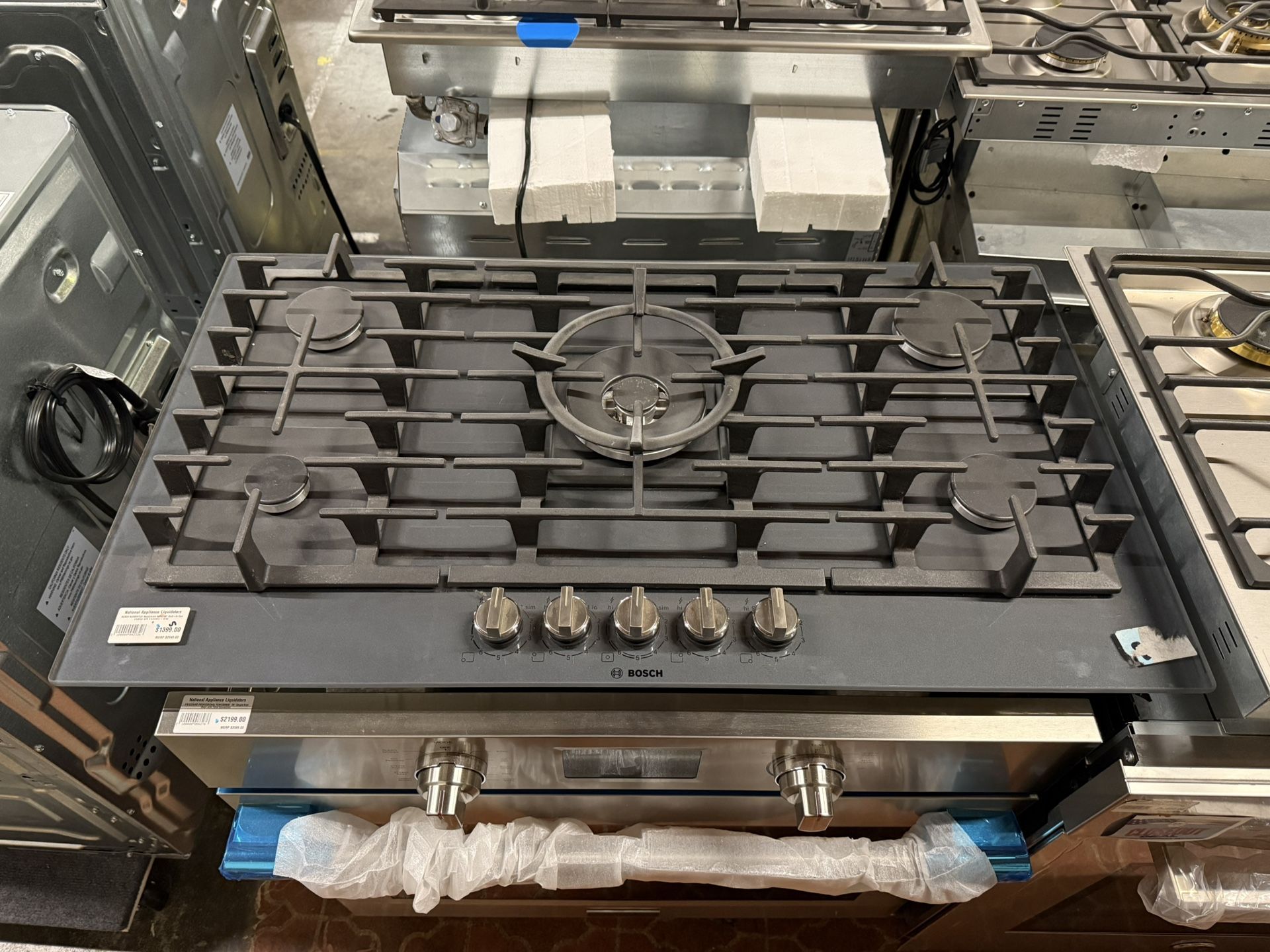 Bosch Benchmark Series NGMP677UC 36 Inch Gas Cooktop with 5 Sealed Burners, Continuous Grates, FlameSelect, Dual Flame Power Burner, OptiSim® Burner, LP Conversion Kit, and Flame Failure Safety National Appliance Liquidators Contact Jake