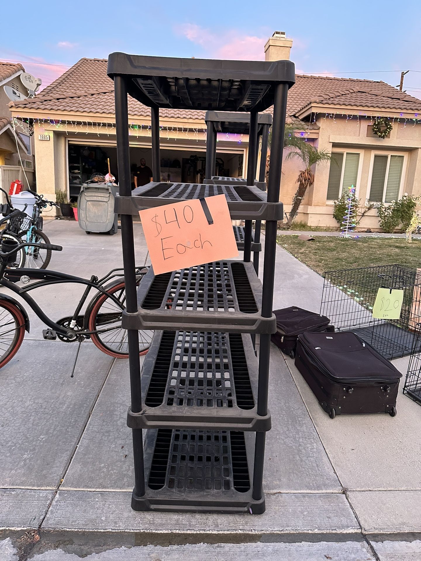 Two size dog kennels XL, M $20 each Five shelf Storage X2 $40 each