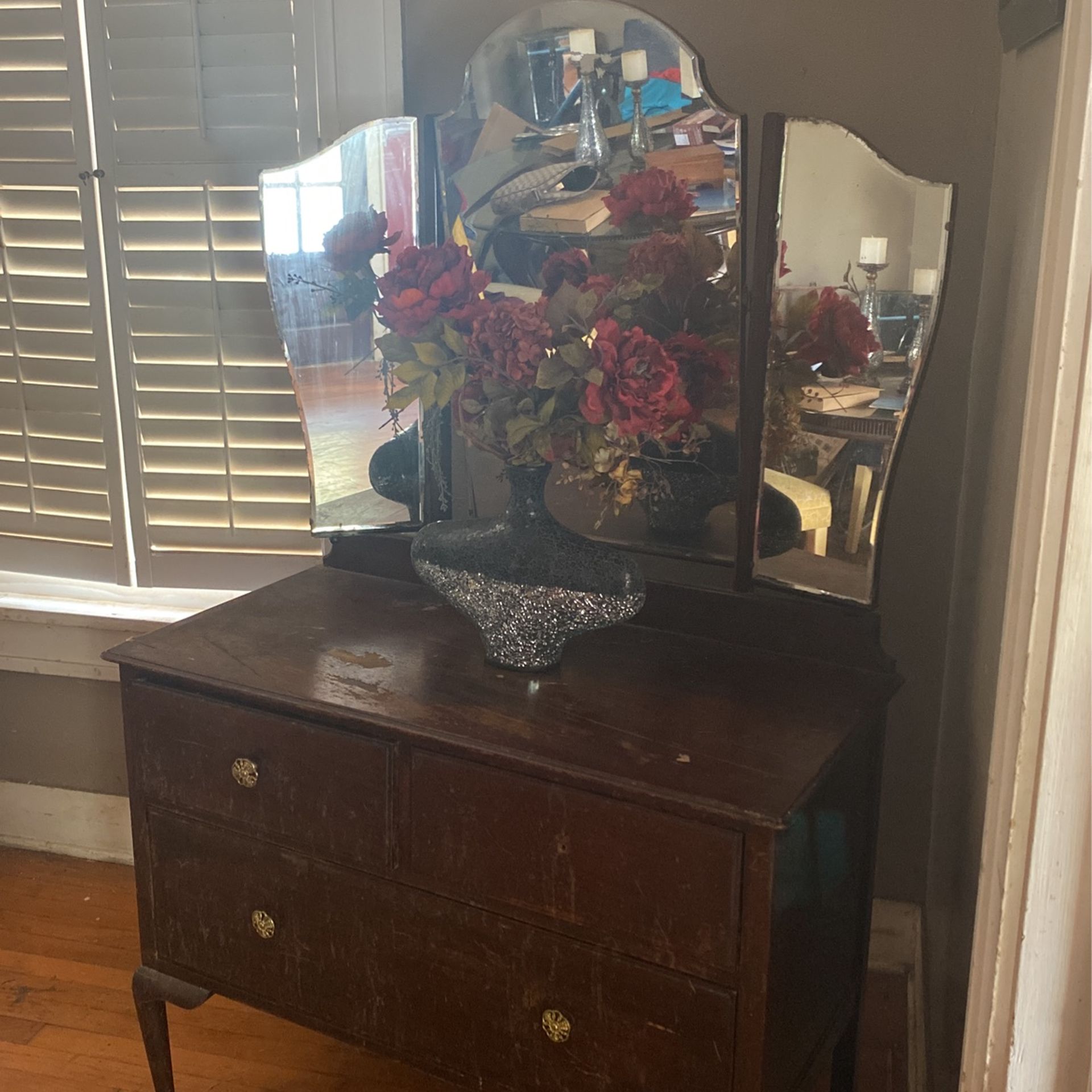 Vintage…two drawers on top and one bottom drawer opens nicely…knobs needs to be change can be used as small dresser or vanity