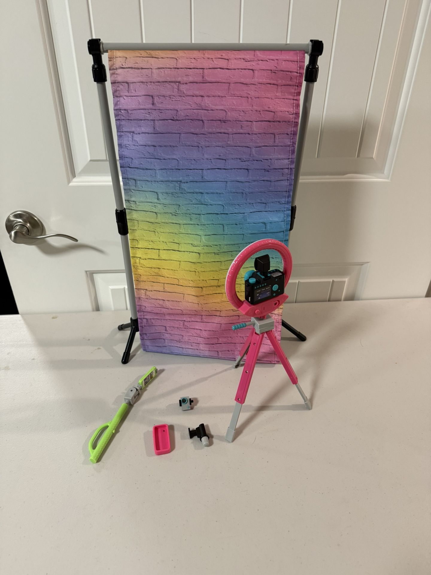 Backdrop, camera with tripod, selfie stick