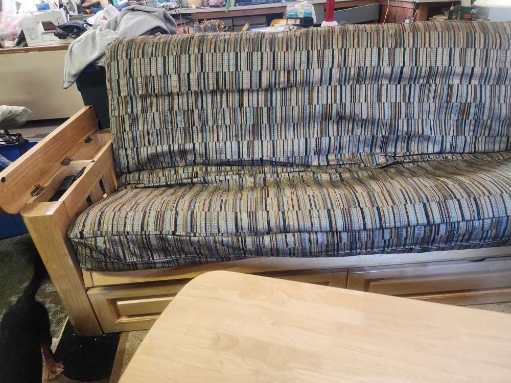 Beautiful beech wood futon with storage drawers, matching coffee table & end table. Comes with very comfortable mattress, cover & mattress protector under cover. This is wonderful for having company staying over. This is incredibly heavy & barely used, been stored for years but I have vet bills that need to get paid. $600 OBO Will trade for new tank less water heater & professional installation. Adding in a pretty rug & Empire style lamp.