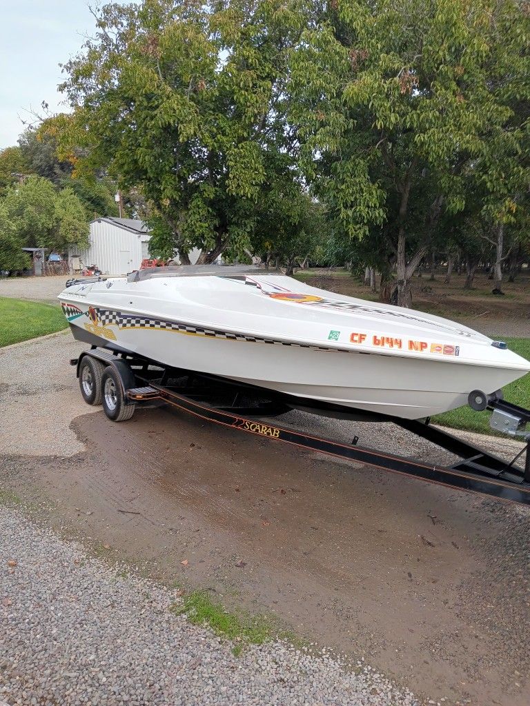 **AVAILABLE TO TEST DRIVE** This 1997 Scarab by Wellcraft is a perfect blend of speed, style, and reliability. Known for its deep-V hull design, this boat offers exceptional stability and smooth handling even at high speeds. Powered by a robust engine, it promises thrilling performance for both racing enthusiasts and recreational boaters. Features: 1. High-quality fiberglass construction for durability 2. Comfortable seating and well-designed cockpit 3. Advanced instrumentation for easy monitoring Only has 110 original hours. In very good condition and the engine is immaculate. DM with any questions. Yes it comes with the trailer.