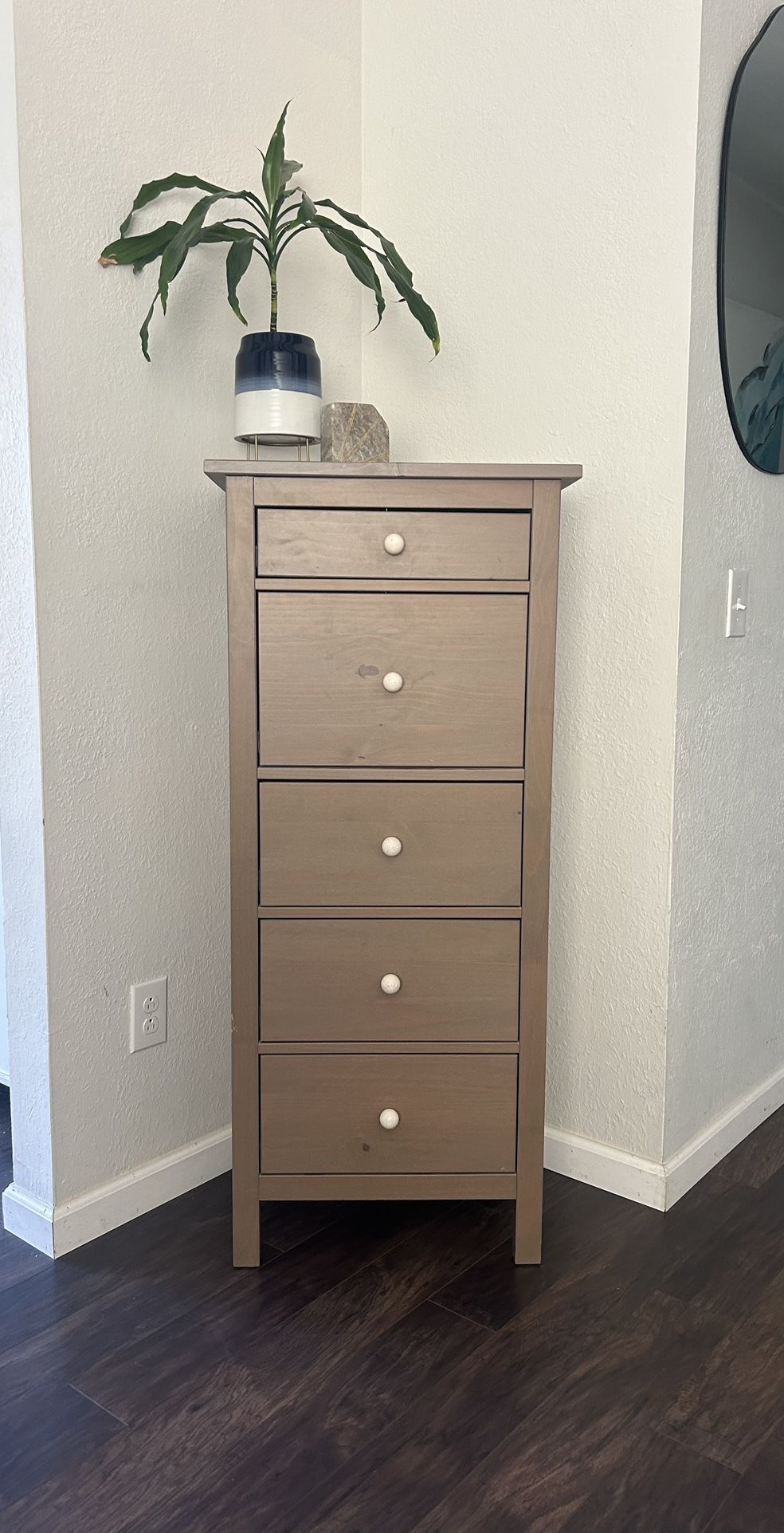 IKEA HEMNES tall boy Discontinued grey-brown stain, a striking color with visible woodgrain. Material is natural pine Knobs have been changed from original. Beautiful dresser with very few flaws. Small damage to top not very noticeable and a few scuffs on one side ( see pics) Width: 22 7/8" Depth: 15 3/4" Height: 51 1/4 " Pretty light Pick up in Vacaville Fcfs - firm in price unless you buy multiple items. Venmo or cash No holds