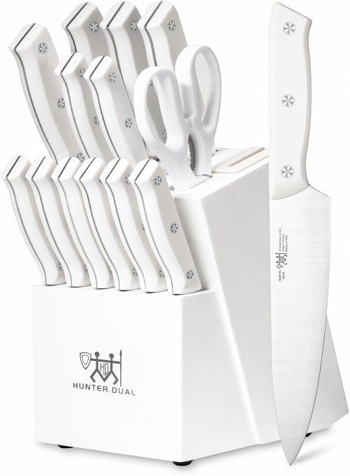 ππππ πππππππ ππππ π πππ - high carbon stainless steel Knife Sets for Kitchen with Block is durable and rust-resistant for longer and more frequent use πππ-ππ-πππ ππππππ - No need to worry about handle breakageγ15-piece knife set includes. 8" chef's knife, 8" slicing knife, 7" Santoku knife, 8" serrated bread knife, 5" utility knife, 3.5" paring knife, 6 4.5" serrated steak knives, 1 kitchen shear, knife block with built-in knife sharpener. ππππππππππ πππ π - The knife set can be washed in the dishwasher, easy and quick to operate, and dry the knife set after cleaning for easy storage, not taking up space. πππππππππ ππππππ - Carefully crafted, ergonomic stainless steel rivets secure the knife to the handle, so you'll feel comfortable and secure when using it without worrying about breaking. All sales are final.