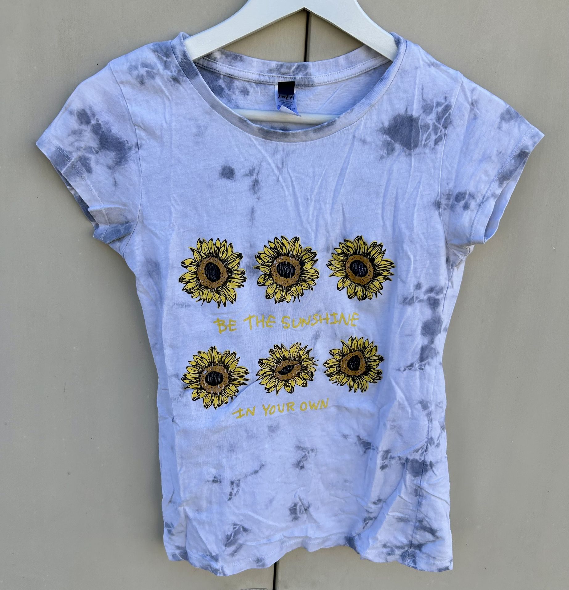 White and grey tie dye pattern. Sunflower graphic with 'Be the Sunshine' text. 100% cotton. Size S.