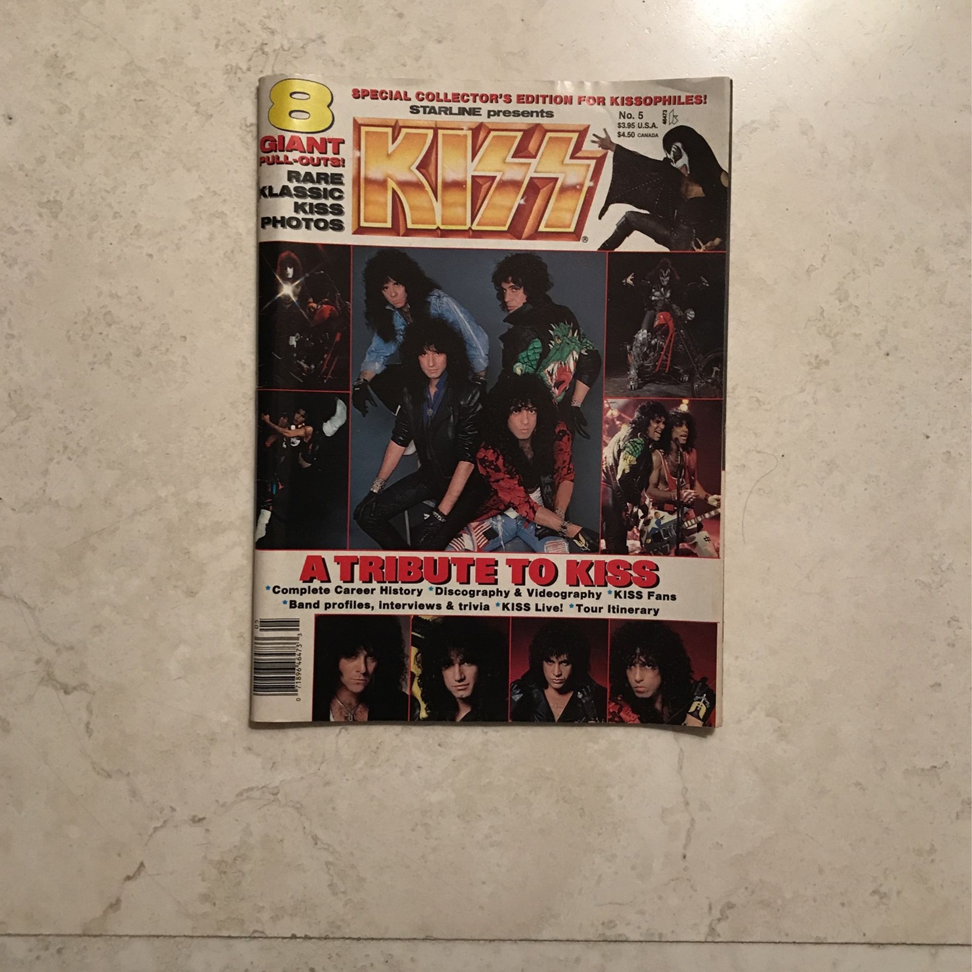 Great KISS magazine from 1987 during the Crazy Nights tour with amazing color photos and all 4 kollector’s pull-outs still intact. Each pull out is double sided (each shown in the photos). Much of the magazine has newsprint style black and white photos and a good amount of editorial content as well spoken directly from the band members. It’s about 58 pages total. NOTE: the back cover showing Bruce Kulick is actually part of the last double sided pull-out. So if that is removed to go up on the wall, which hopefully it is, the magazine won’t have a back cover anymore. Full disclosure on that. Long live the KISS Army. Cheers.