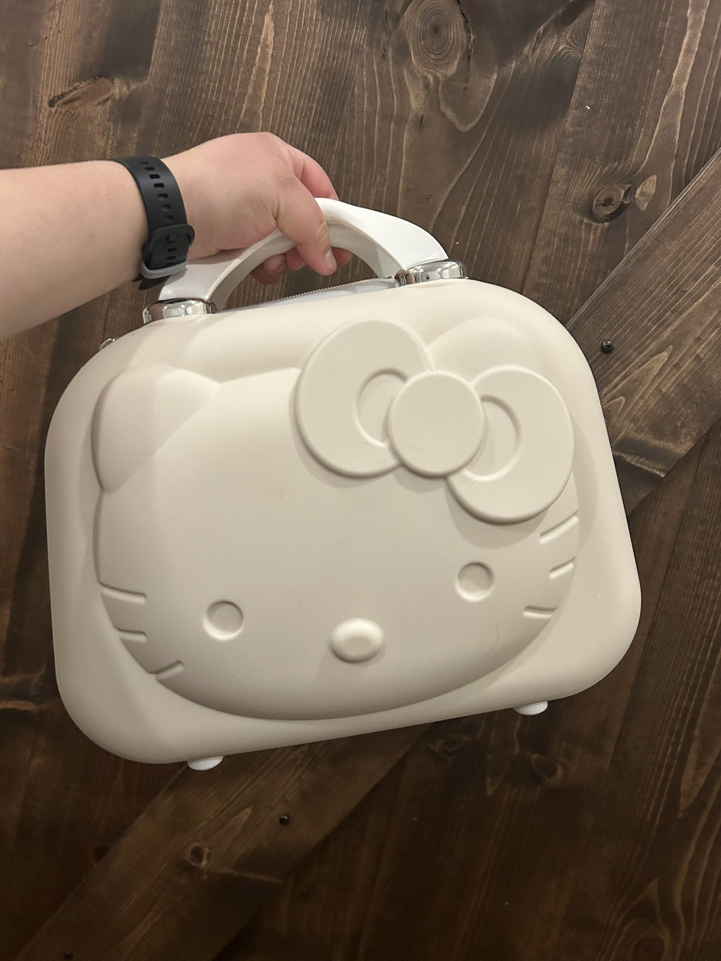 New. Never used. Packaged hello kitty suitcase hard cosmetic case. Cream or beige color. Brand new.