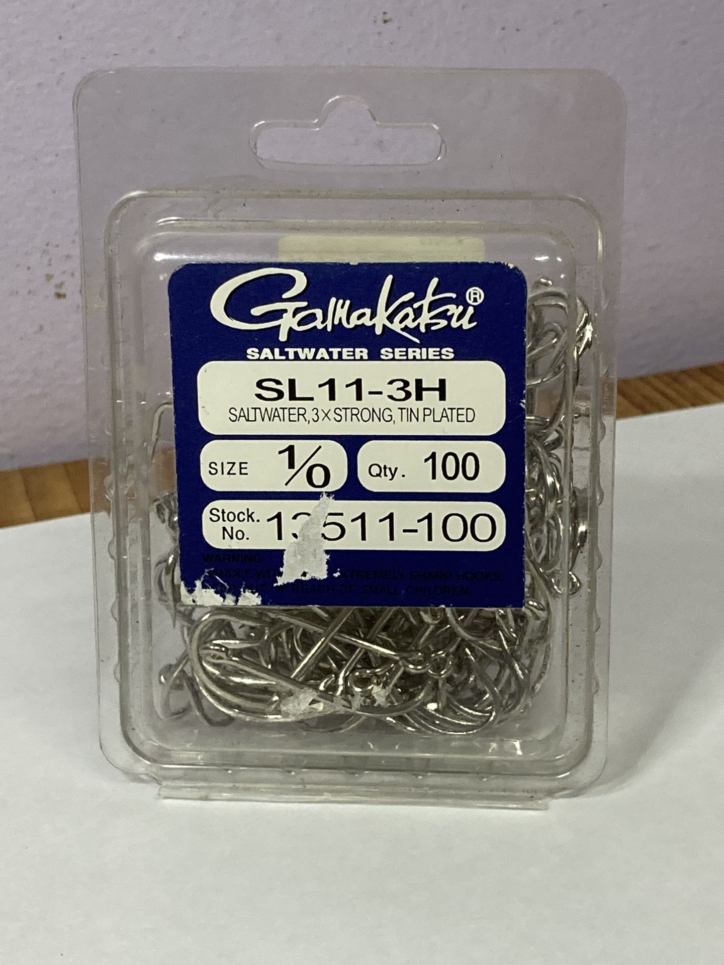 Box of 100 Gamakatsu fishing hooks. SL-11-3H, Size 1/0 Stock No. 13511-100 Salt Water3x Strong, Tin Plated New