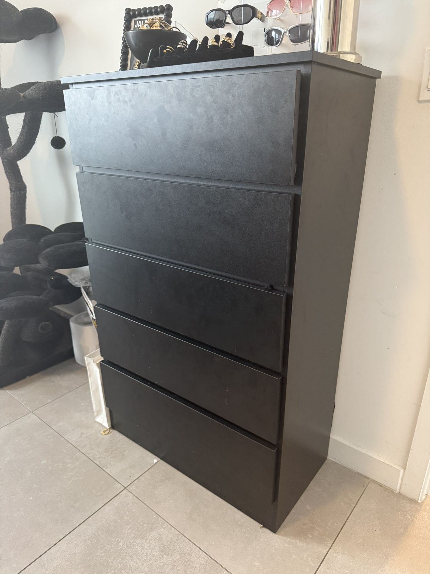 Drawer chest of 5 drawers in black. The dimensions are approximately 27 1/2" (width) x 15 3/4" (depth) x 44 1/8" (height)