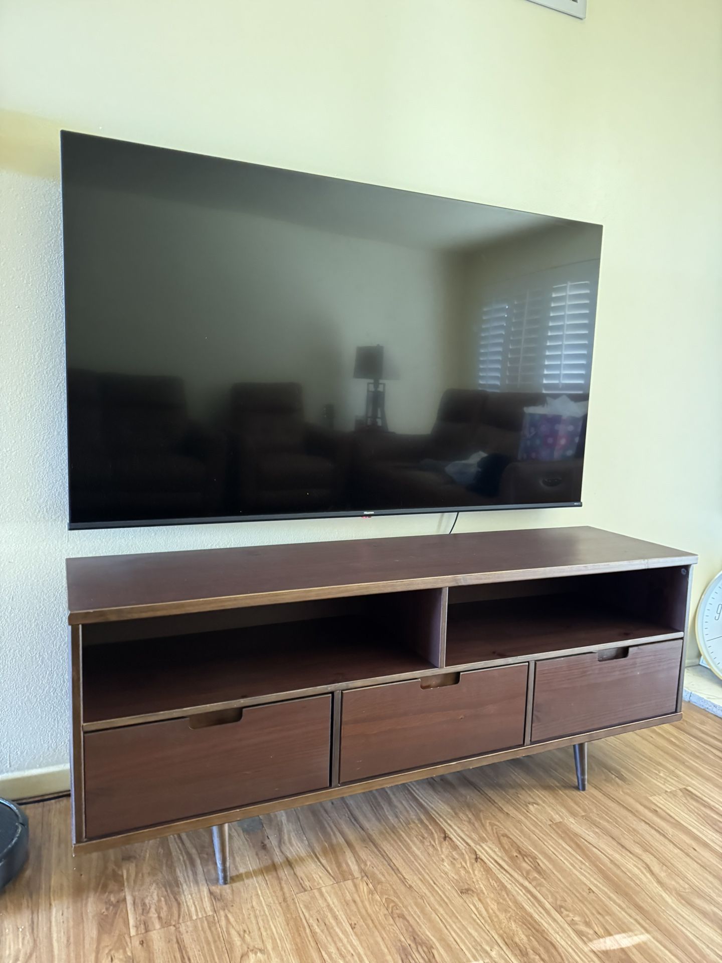 Mid century style tv cabinet Wood 58” L 2ft T 15 1/2 Deep Great condition and will work with TV’s up too 65” $150 obo
