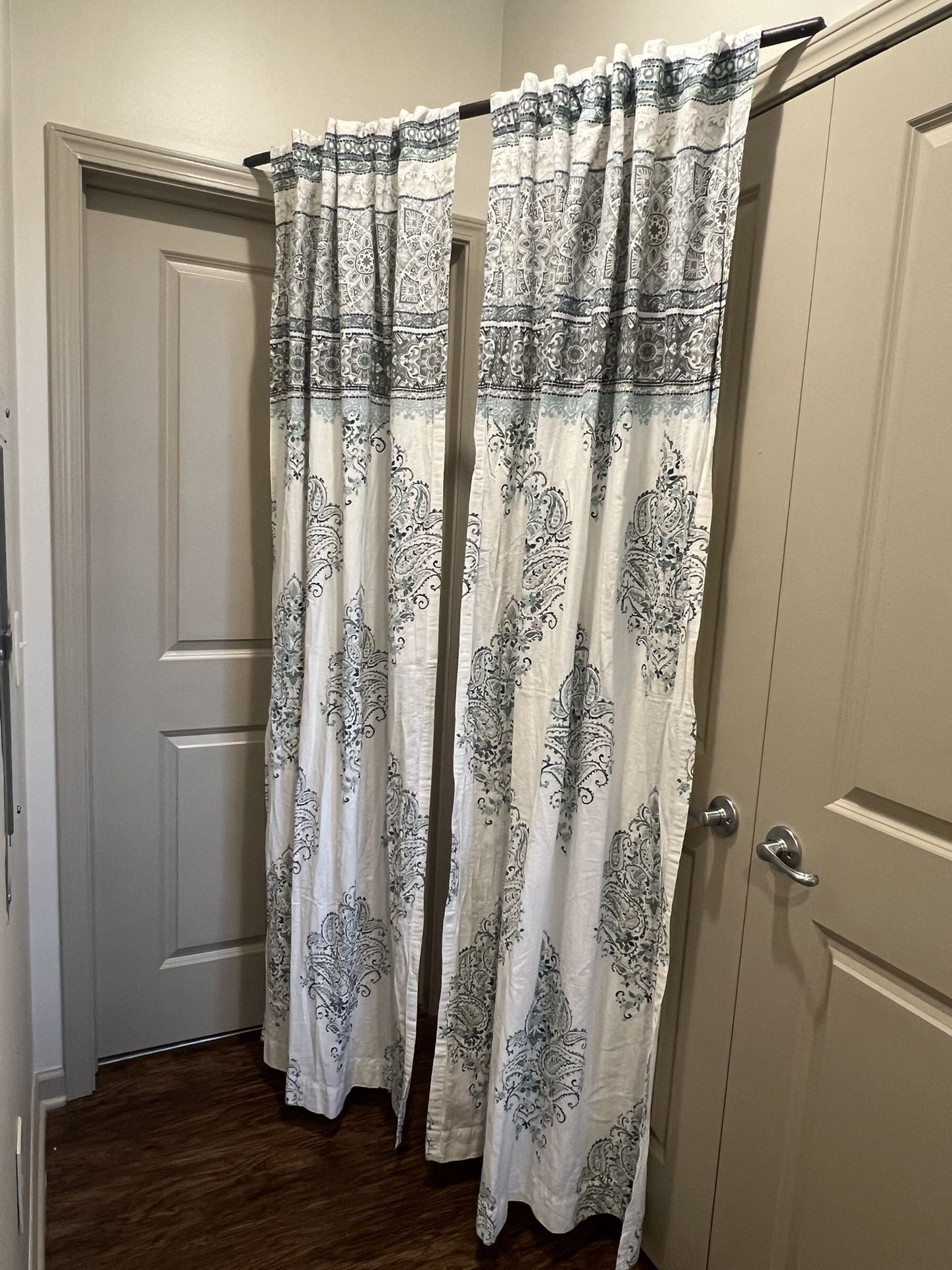Elegant patterned curtains with a decorative design. Come with (2) panels that work great in main rooms. These curtains are like new and measure 45in wide x 81.5in long. They come from a smoke and animal free home.