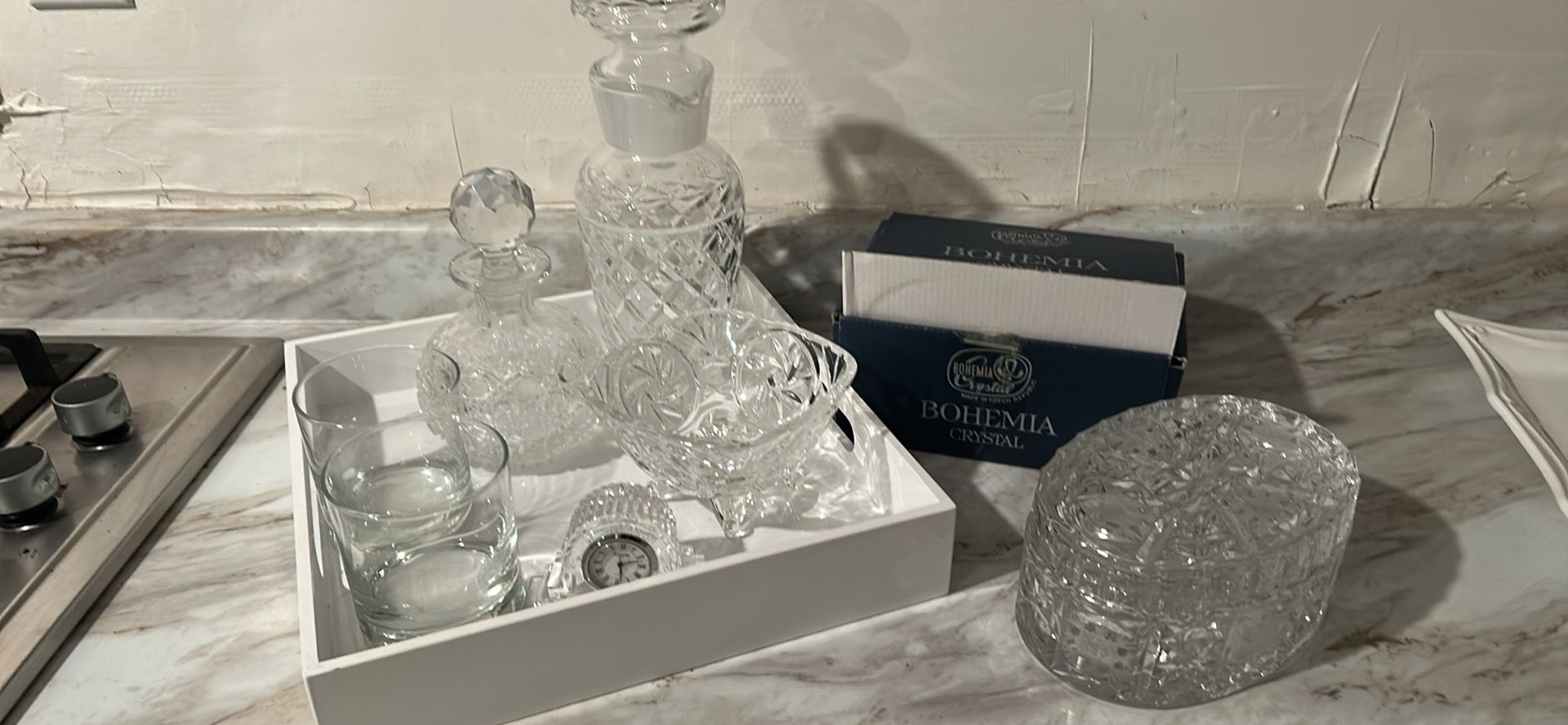 West elm tray and crystal decor