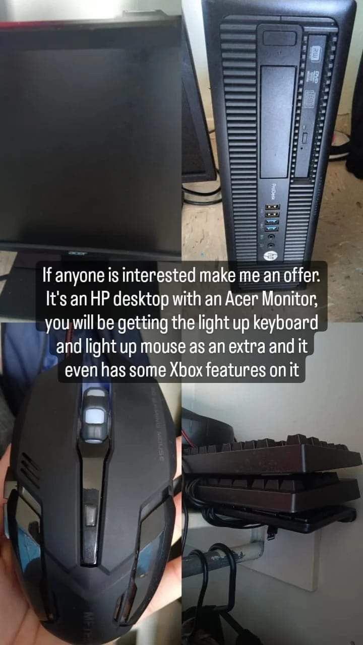 It is an HP desktop with Microsoft and Xbox features. It has an Acer monitor and multiple keyboards and mouse that are led and not led that come with it since it was suppose to be for my kids but they never use it. Need the money and the space. Works great. Can be used for business as well.