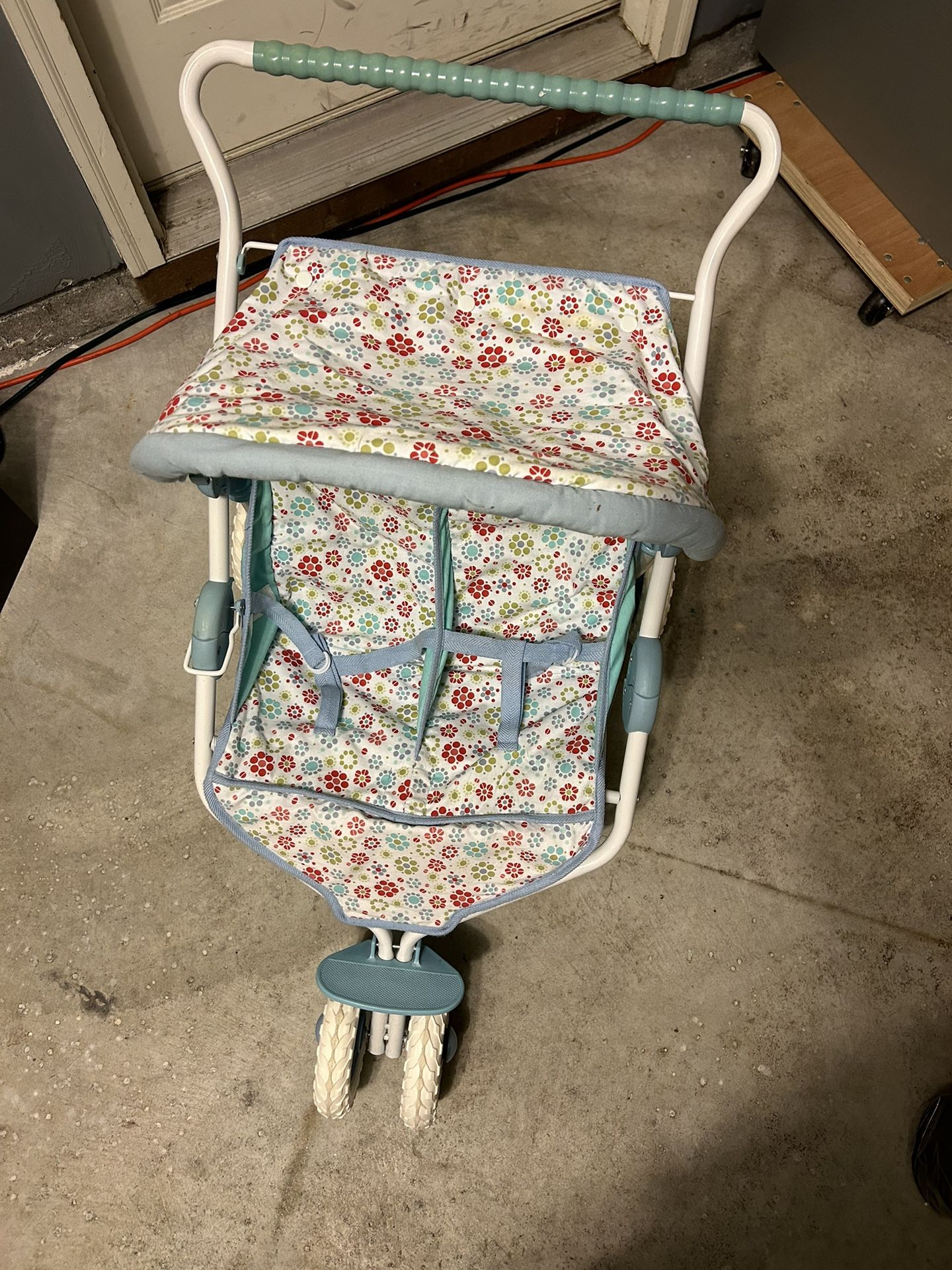 This AG Bitty Baby DOUBLE stroller is in magnificent condition. Can no longer be purchased through company. Adorable printed design by high quality, well made American Girl brand. Holds 2 baby dolls, with working harnesses to strap them in and a pull-over umbrella top, for a little shade :). Also, has a stowage area under the seats for keeping those special baby items, while you’re on the go! Wheels are all in great shape with very little wear and roll along very easily! Folds nicely, for easy storage. Overall Size: 26" Tall x 21 1/2" Wide x 32" Long