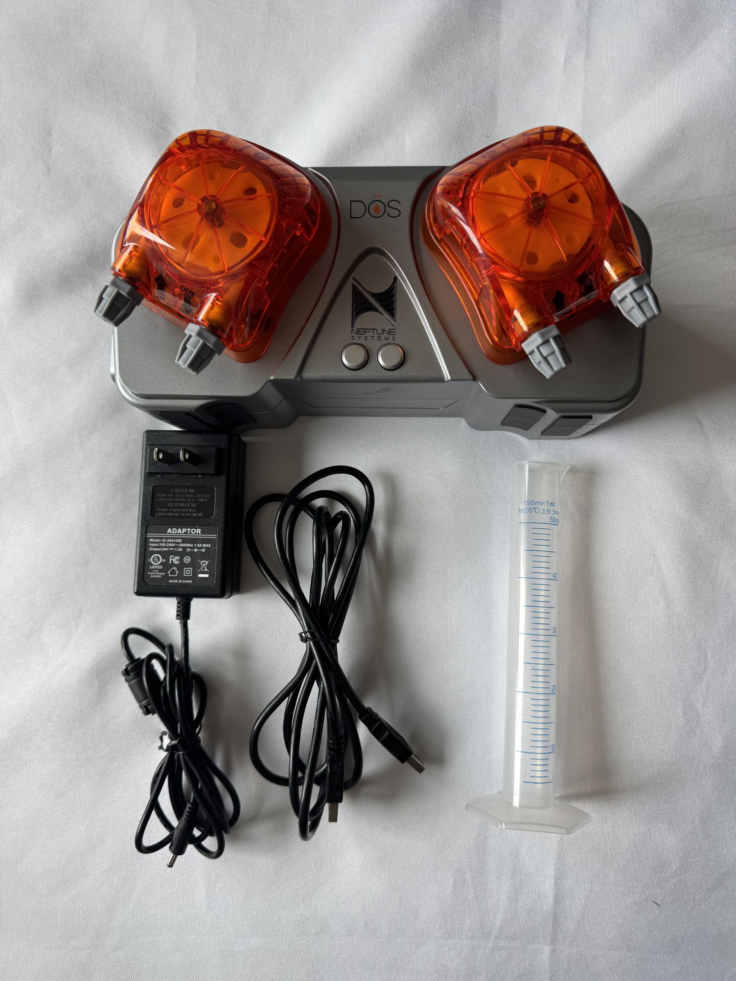 Neptune Systems Apex Dos Dosing Pump With Power Supply, calibration cylinder, and aquabus cable. It includes everything you see in the picture. Pump works great no issues. I have flushed out the lines with RODI water.