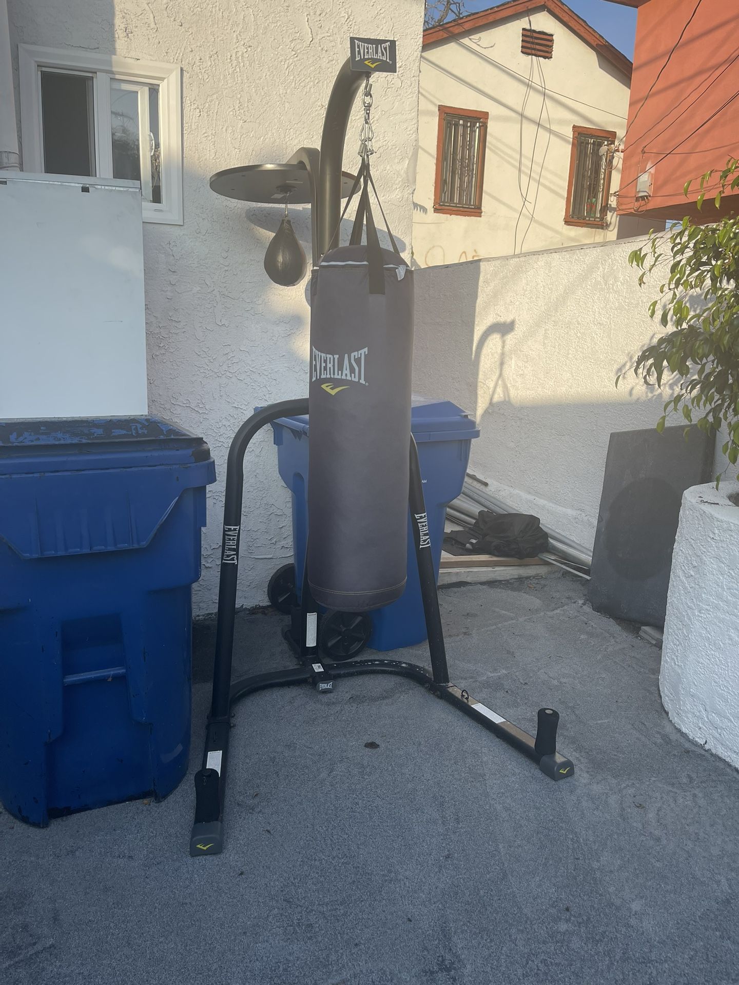 The Everlast Sporting Goods Dual 2-station Heavy Bag Stand is a space-saving stand for a heavy bag and speed bag. features 3 weight plate pegs to withstand punch after punch. The heavy bag side can hang bags up to 100 lbs, and the speed bag side is height-adjustable. Designed for indoor use, inside the home or out in the garage. I sell everything together