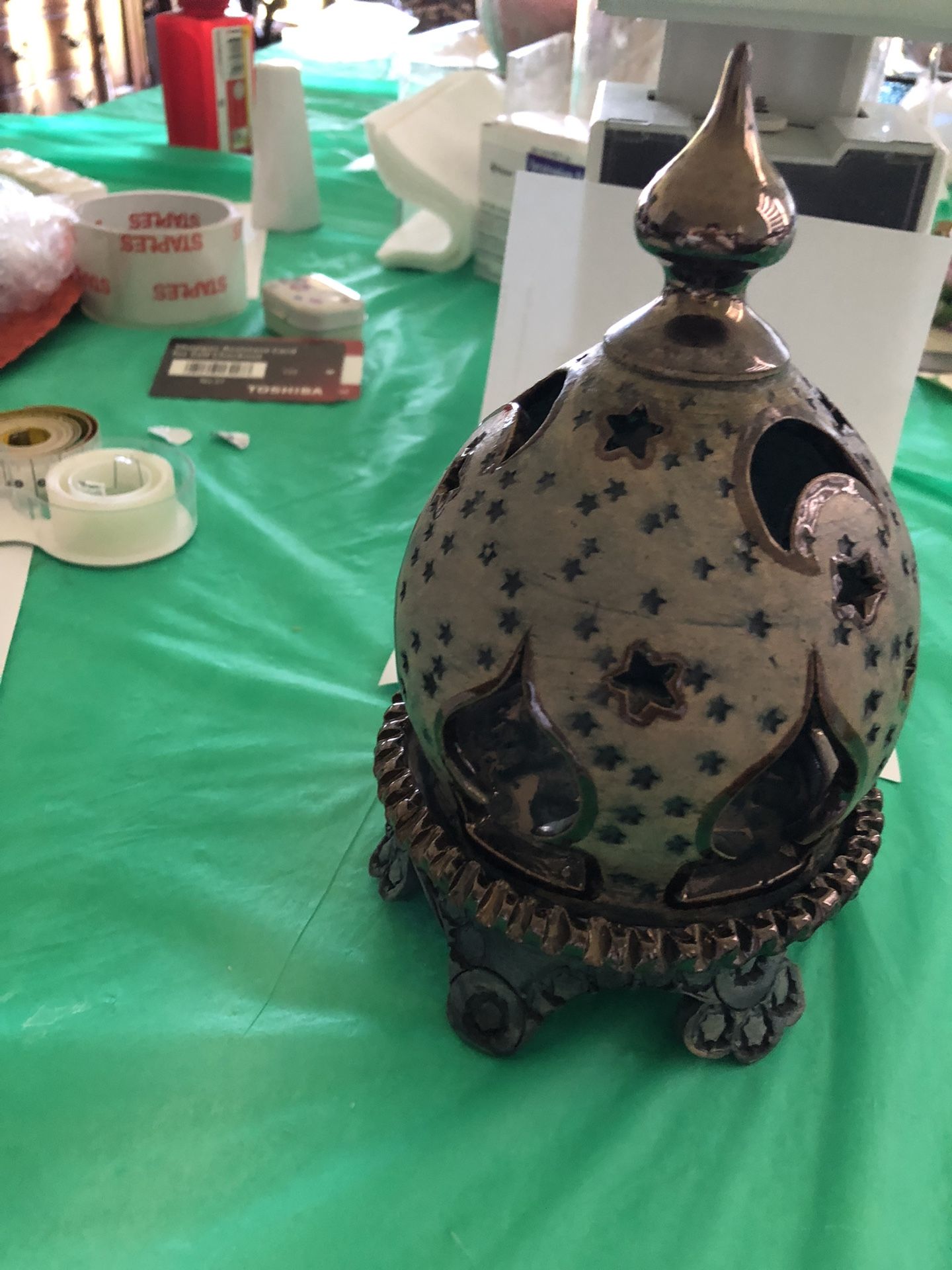 The tower from which the faithful are called to prayer five times each day by a muezzin, or crie. Such a tower is always connected with a mosque and has one or more balconies or open. I is two pieces decoration. With a metal base. Size 7.5 long all together and 4.5 diameter. Weight 10 ounces. (3-16 a, b)