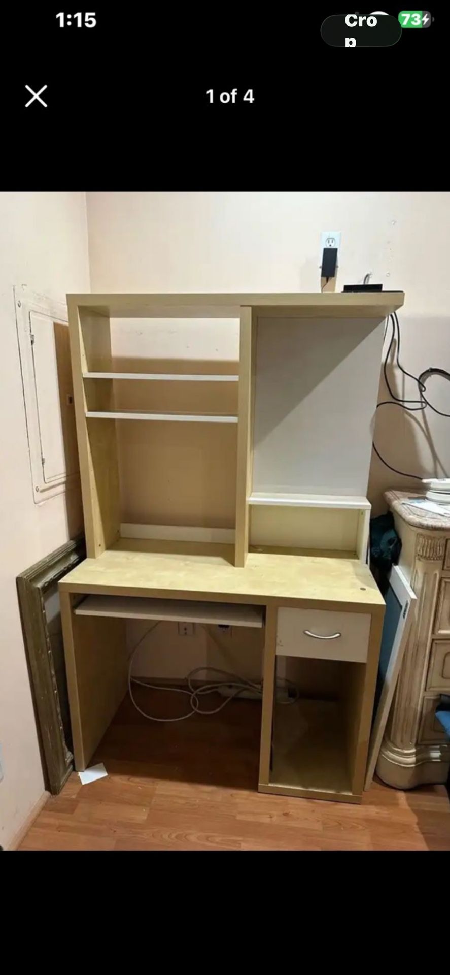 Desk with Hutch and pull out shelf. Brown Light beige Light colored wood. Furniture Has a small drawer. $85 to $99 Each cash. Could be used as a vanity table. Vanity table Make up table Desk is 41 inch long Height of desk without Hutch is 30 Inch 21 Width SERIOUS BUYERS ONLY. CASH AND PICK UP ONLY. SORRY NO TRADES OR DELIVERY White table is about 45 inch long.