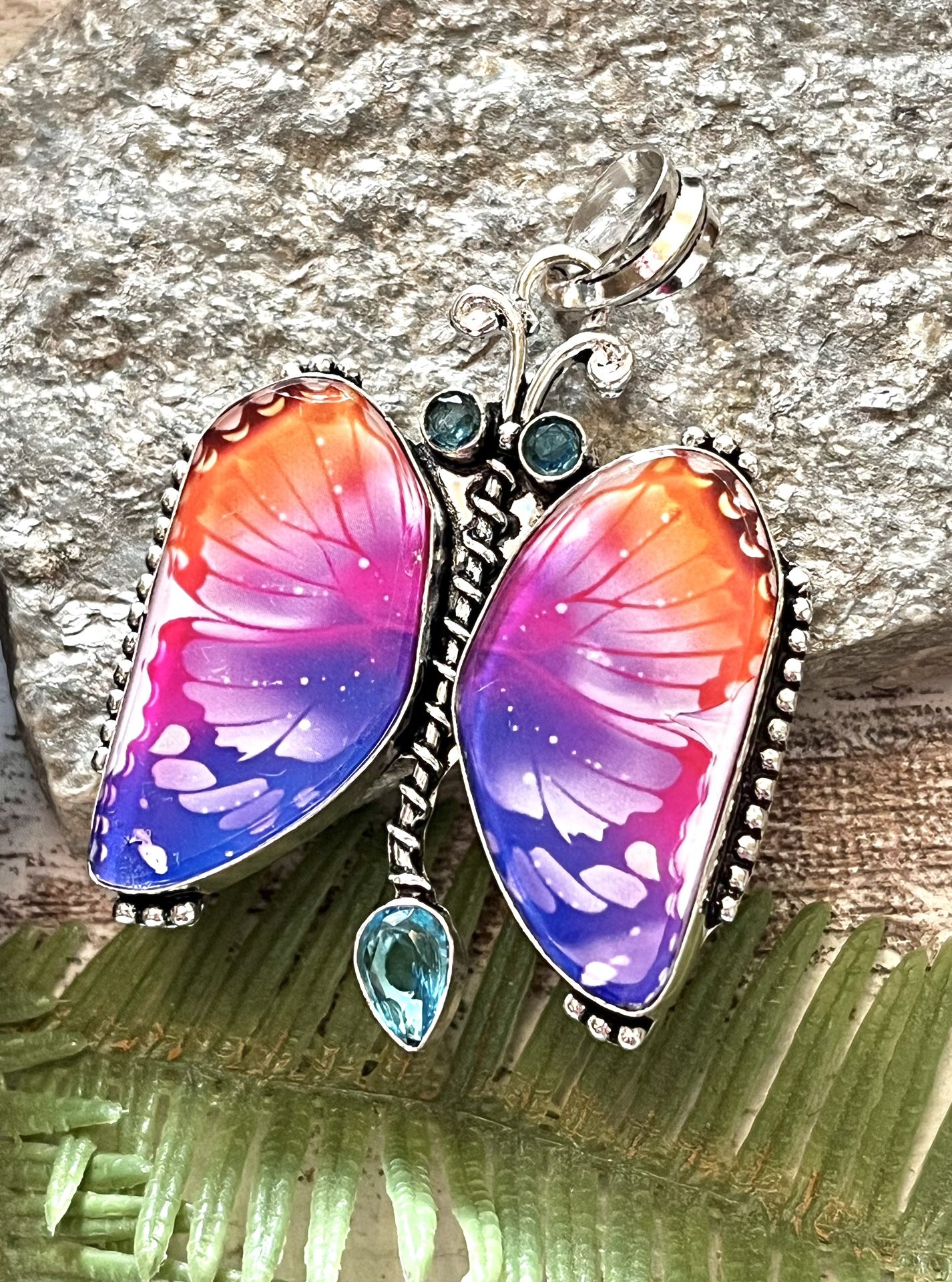 Fancy Dichroic Glass & Blue Topaz Butterfly 2.3” Pendant