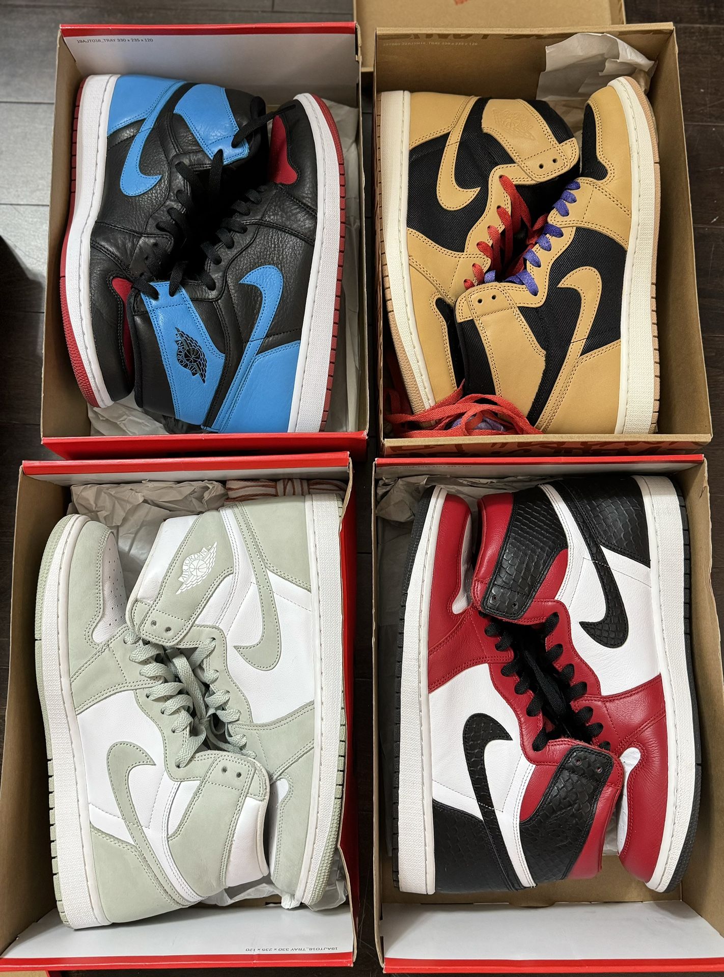 Jordan Seafoam 1s size 12W 10.5M Jordan Satin Snake Chicago 1s size 12W 10.5M Jordan NC To Chi 1s size 12W 10.5M Jordan Heirloom 1s size 10.5 ALL VNDS $140 Each