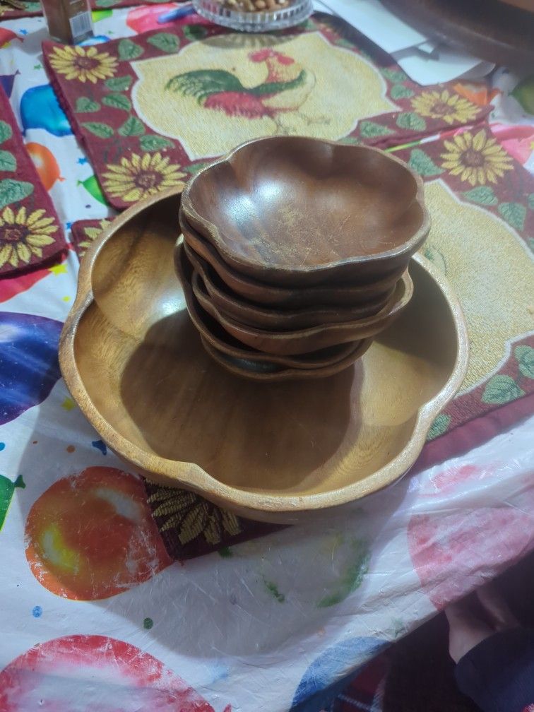 Hand Carved Wooden Flower Scallop Shape Bowl Set of 6 Philippines Vintage