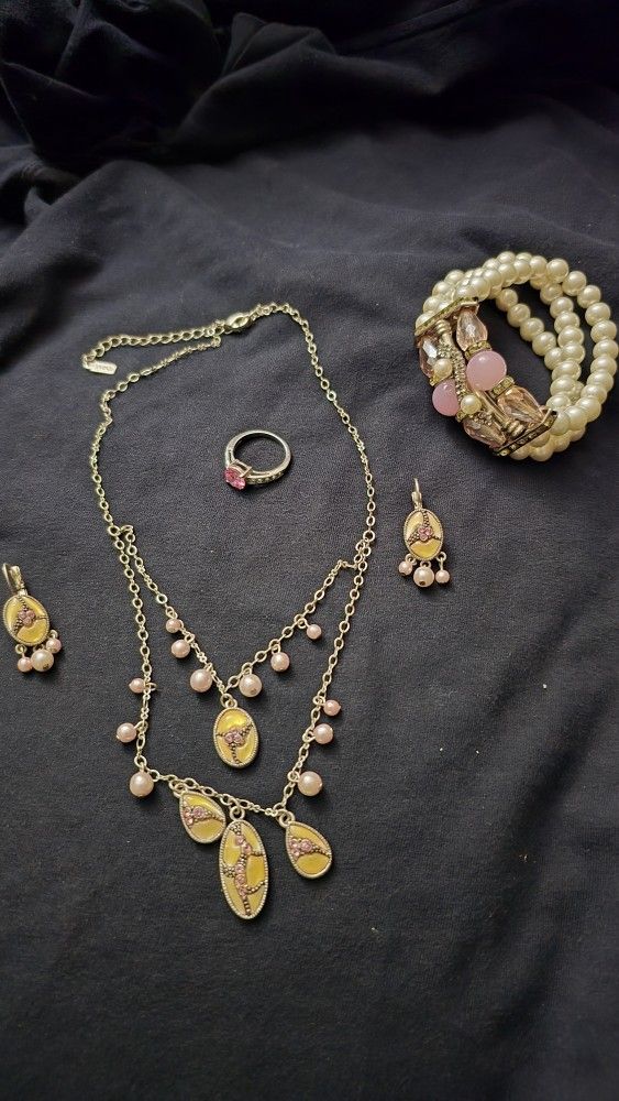 Brand new 5 piece mother of pearl beaded jewlry set in pink color. Very beautiful multilayer necklace, stamped 1829. Shiny cubic zirconia pink and white stones ring size 7/8. White and pink crystal and rhinestones stretch bracelet. Can be shipped if buyer pays shipping. Pick up in smoke free pet free home in woodbridge va