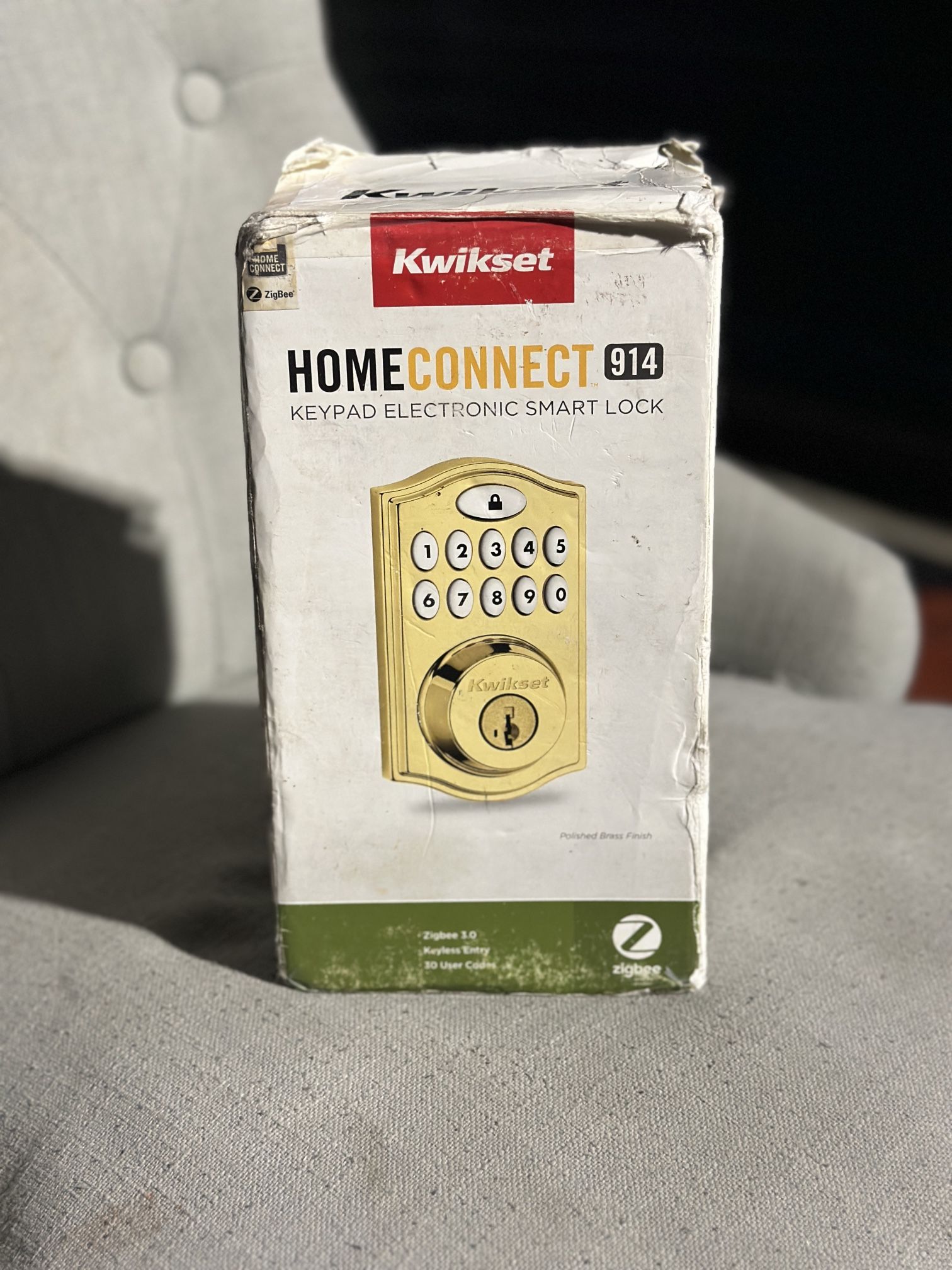 New Kwikset keyless entry touchpad door deadbolt system in a polished brass finish. Stores up to 30 access codes. Zigbee 3.0 communicates with smart home systems and allows for remote control. Bought as an option when we changed out our front door handle/lock. Opened the box but didn’t end up installing it. Forgot we had it still (over a year now); just found it… Box is messy but parts are all new, included and never opened.