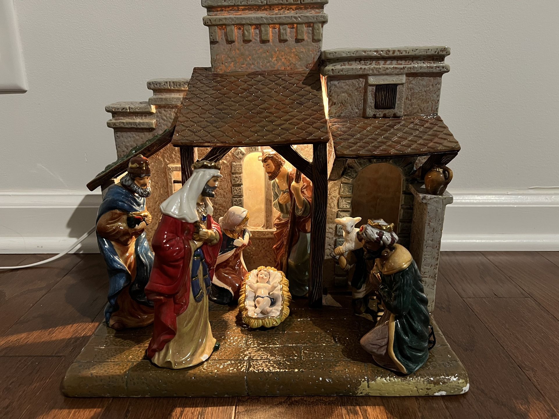 Celebrate the holiday season with this rare and beautiful 10-piece nativity set with a barn that lights up. The set features ceramic figurines of The Holy Family, 3 Kings, a Shepard and a donkey. The barn measures 12 inches in length and height, and 8 inches in width. The light-up barn, adds a special touch to your Christmas decor. The multicolor set is perfect for collectors and believers alike, and is sure to become a treasured addition to your collection. Made in China, this nativity set is part of the Seasons collection and is perfect for any occasion. Bring the spirit of Christmas into your home with this lovely set. The set is very old and does not come in the original Styrofoam box. Measurements are as follows: Barn - 13x12x8.5" Mary - 4x2x2" Joseph - 6x1x2" Baby Jesus - 2x1.5" Manger- 2.25x 2" King w/Treasure - 6.5x2x2" Arabic King- 6.5x2x2" Black King- 4.25x2x2" Shepard - 4x2x2" Donkey - 2.5x2" Light Kit is Included. LOCAL PICKUP ONLY. NO SHIPPING.