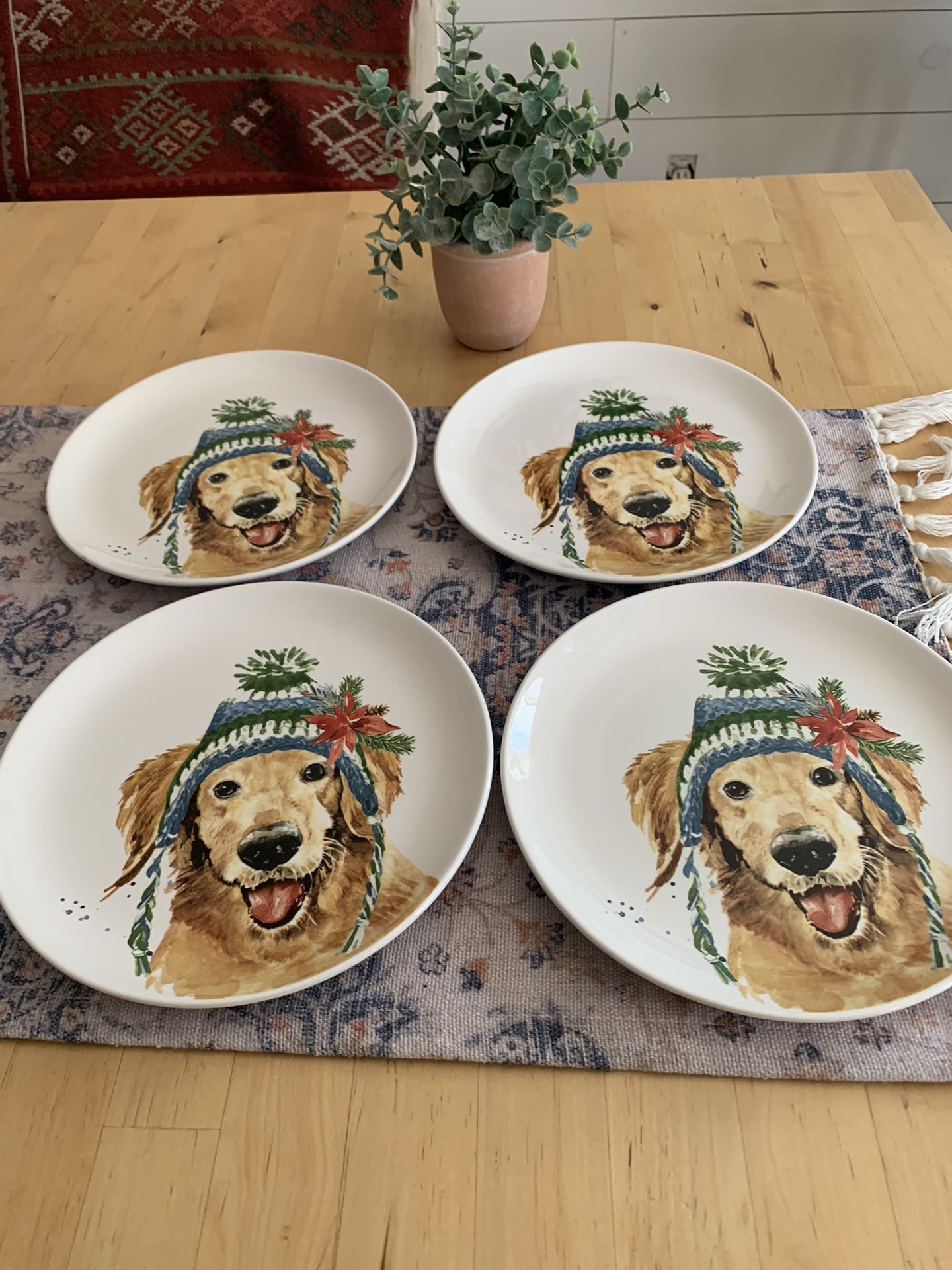 This festive set of four golden retriever dog plates by Robert Stanley features an adorable pup decked out for the season. Perfect for you holiday table, appetizers or display. Measures 8.5”. One plate has a super tiny, barely noticeable scuff/chip. Microwave and dishwasher safe.