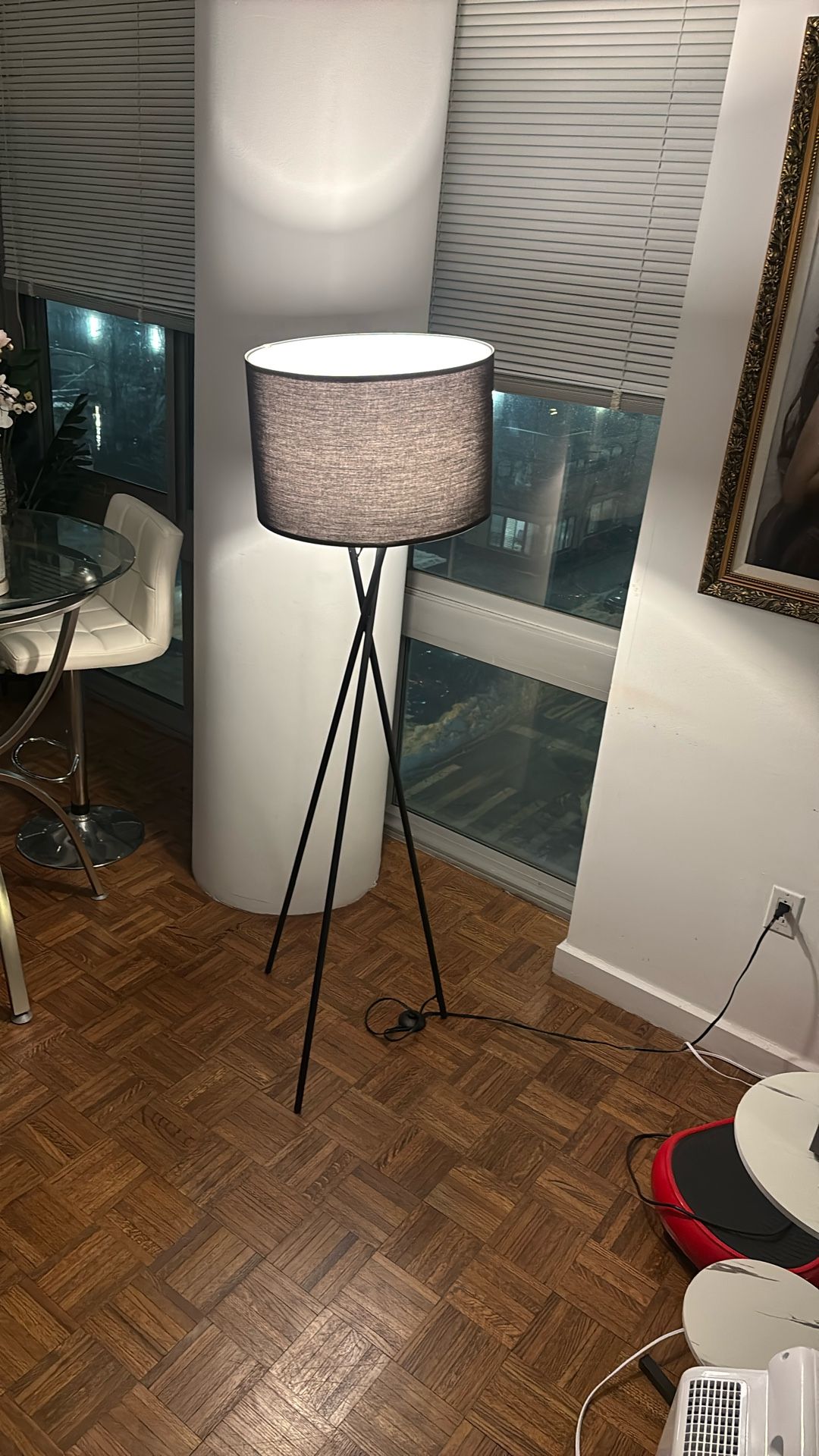 Modern black floor lamp with tripod base and drum shade. Features a convenient foot-on/off switch located on the cord at floor level. Sturdy, minimal design. Works great and in good condition.
