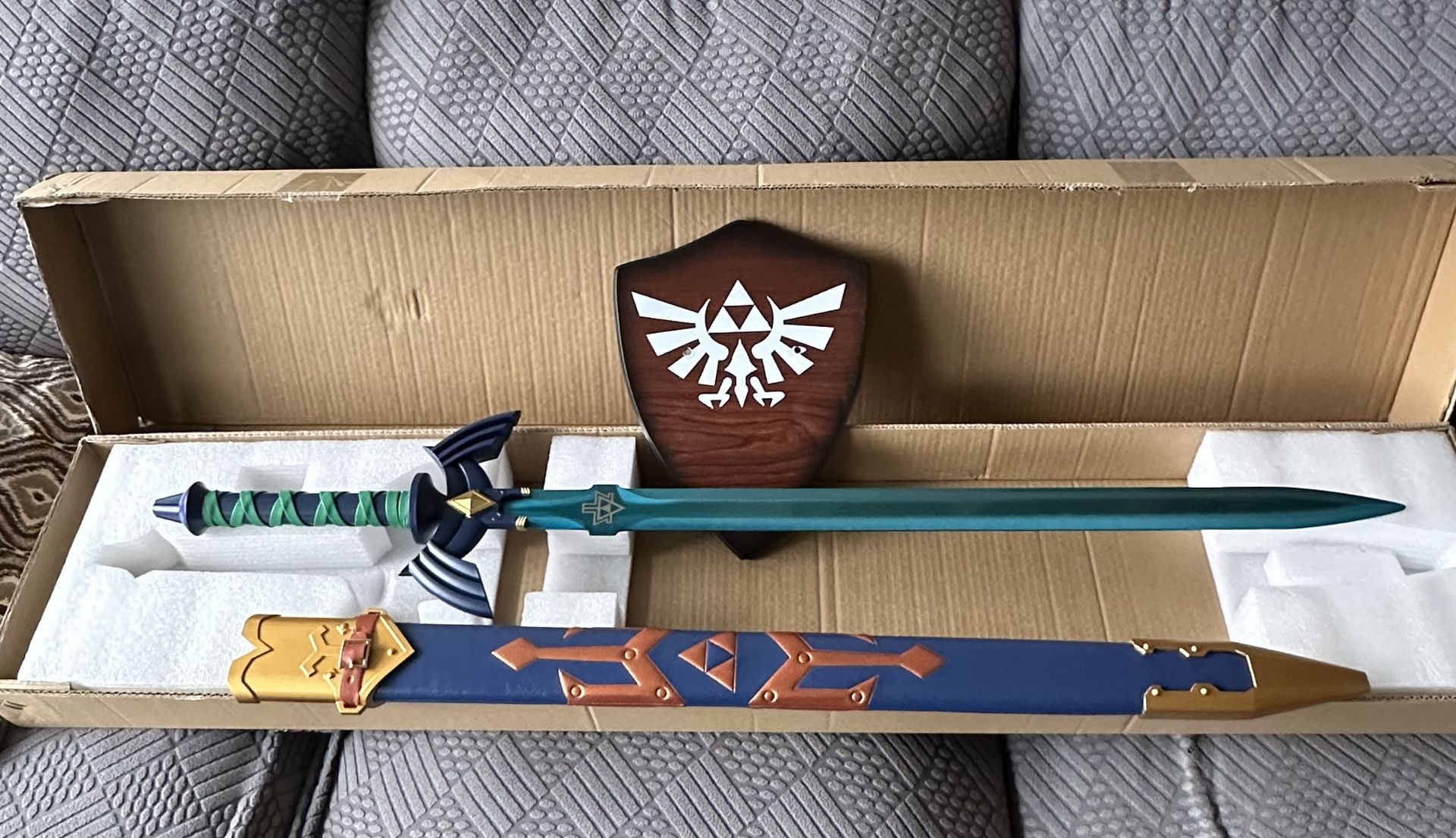 Zelda Blue Master Sword Nintendo Legend of Zelda Authentic Zelda Blue Master Sword. Comes in the original box plus a shield where you can hang your sword along with screws. Sword is very heavy. This is not a plastic toy version. This thing weighs about 2 to 3 pounds. Sword blade is 39 inch long. Item is brand new, taken out just for photo purposes. Asking $500 or best offer.