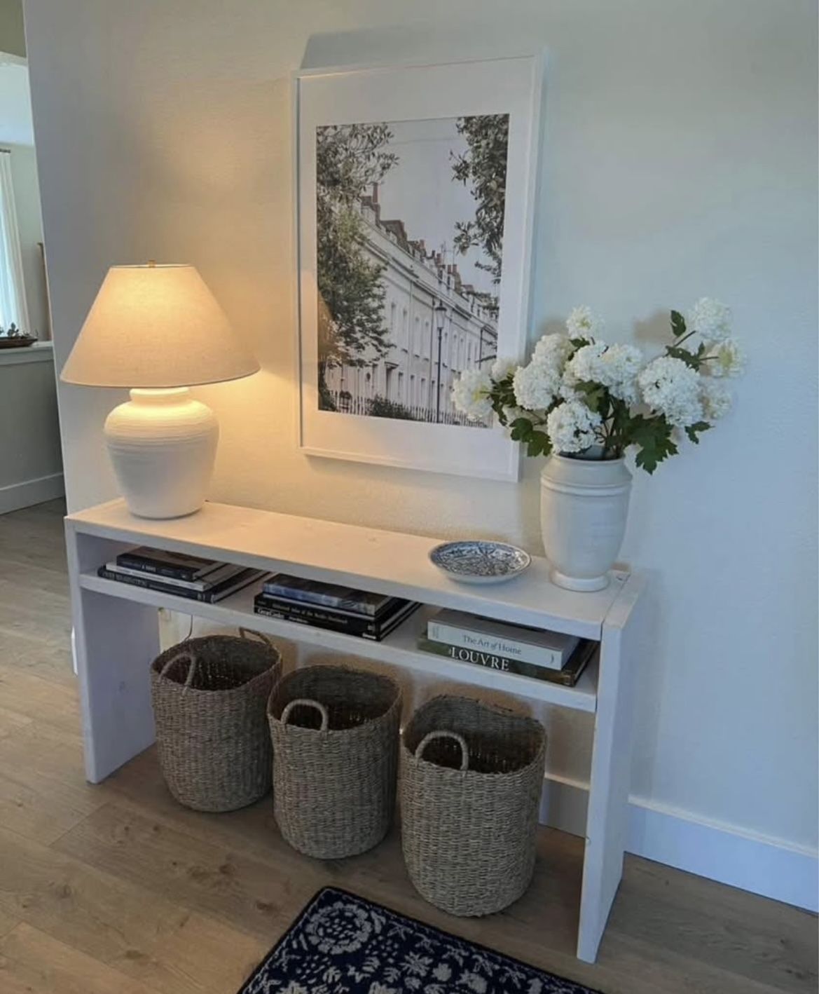 Custom made entry table/sofa table/console table. Made from solid wood (fir) - no veneer or plywood. Pocket hole joints for clean edges with no visible hardware. Sturdy and secure! White paint washed. Could also be painted or stained etc. Height 30” Depth 11 1/8” Width 55”