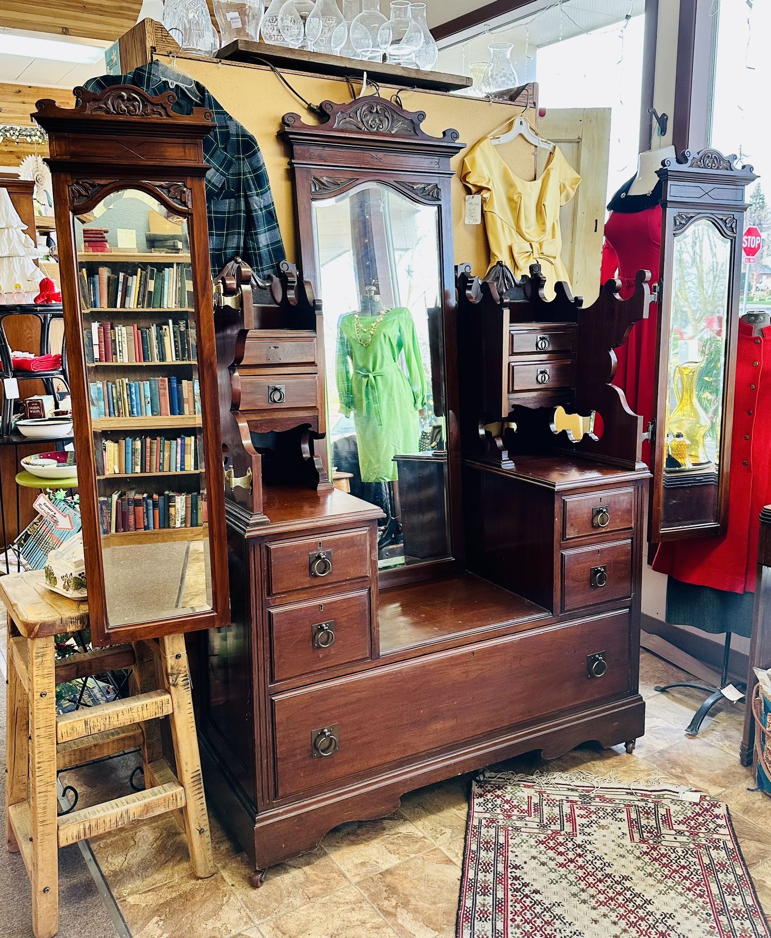 This Eastlake dresser made in 1878 is an absolutely stunning piece of furniture! The detail on every piece is incredible. It measures 49” wide/76” wide with both mirrors open, 20 1/2” deep X 80” high. $490.00 Firm Price. Retro Revival 280 N Grant St Canby Or 97013. Open 10-6 Mon-Sat & 10-5 Sun.