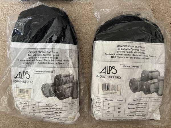 Two new in package compression sacks $60. I will only conduct transactions in the local police department parking lot visitor parking and internet exchange area. 1 of ALPS Mountaineering Compression Stuff Sack - X-Large 12"x25" Blue Color 1 of ALPS Mountaineering Compression Stuff Sack - Large 11"x23" Rust Color