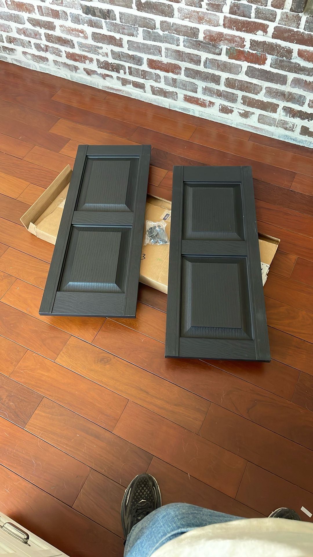 Black vinyl decorative shutters. Measure: 15”x 39” New in box.”