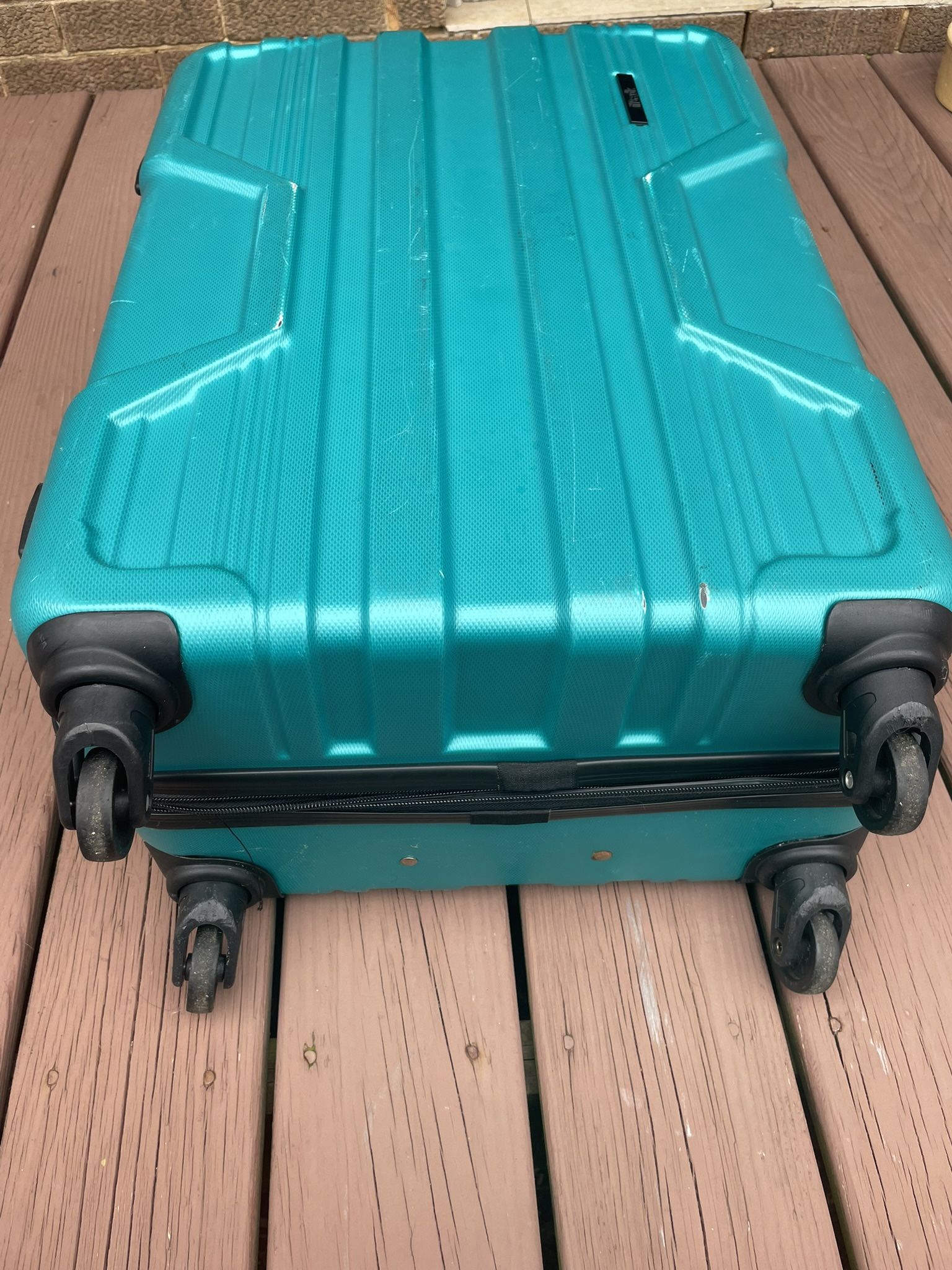 4 Wheels Spinner Check In Luggage, iPack Hard sides Turquoise suitcase. 25.5” H x 17” W x 10.5” D x zipper expands additional 2”. Easy maneuverability. Medium size Larger than carry on but smaller than XL suitcase. Inside material divider zipper doesn’t work but that’s just on inside. Good clean condition, smoke-free. Habla Español, maleta mediana 4 ruedas