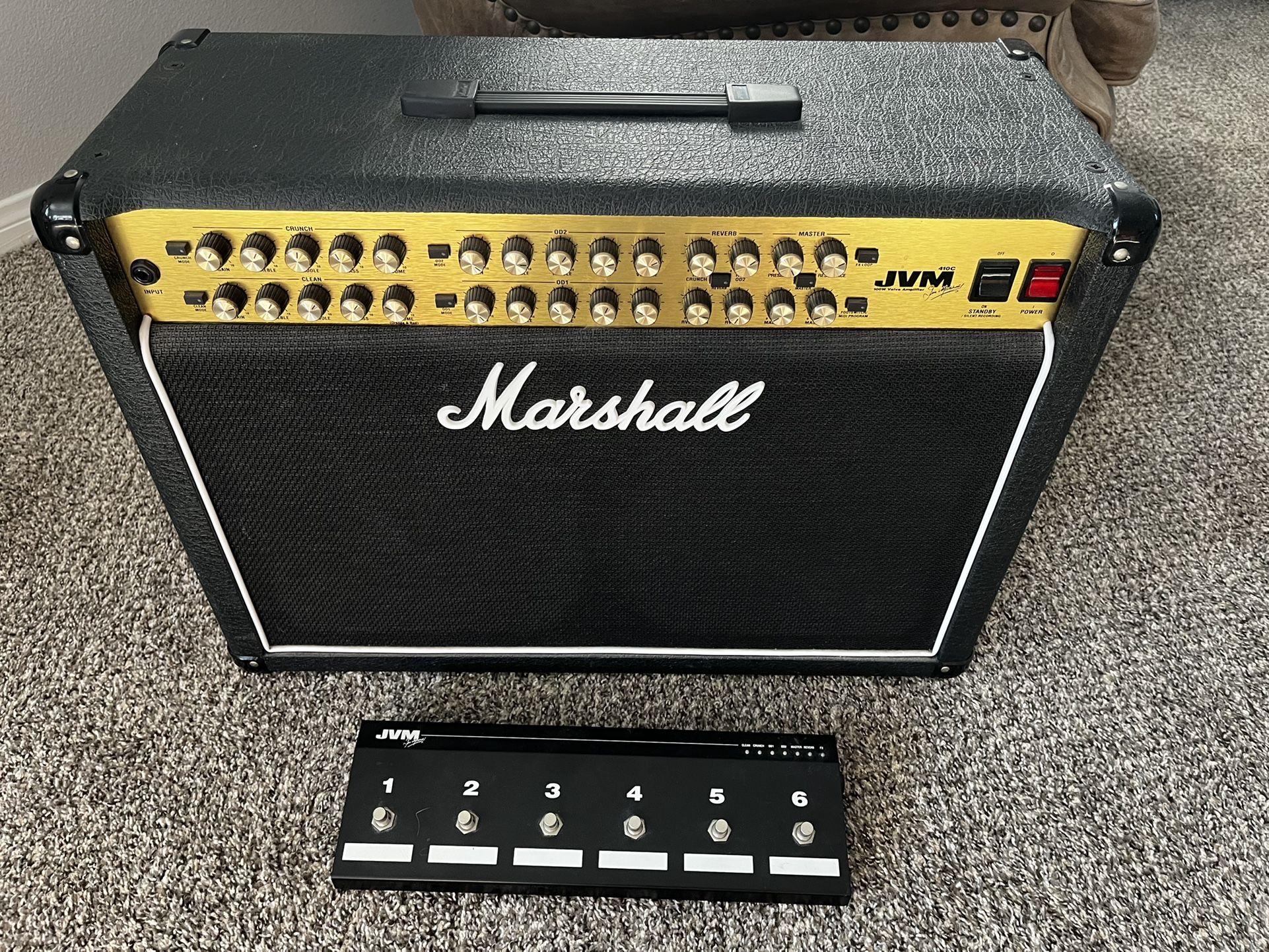 This amp is like new it has never left my home studio and because of the size of the studio it hasn’t been turned up past 3 on the channel or master volume knobs. Tubes are in perfect condition as is the rest of this amp. You won’t find one closer to new. This also comes with the JVM foot pedal that allows you to pre-program your settings for up to 6 different channels and change on the fly!